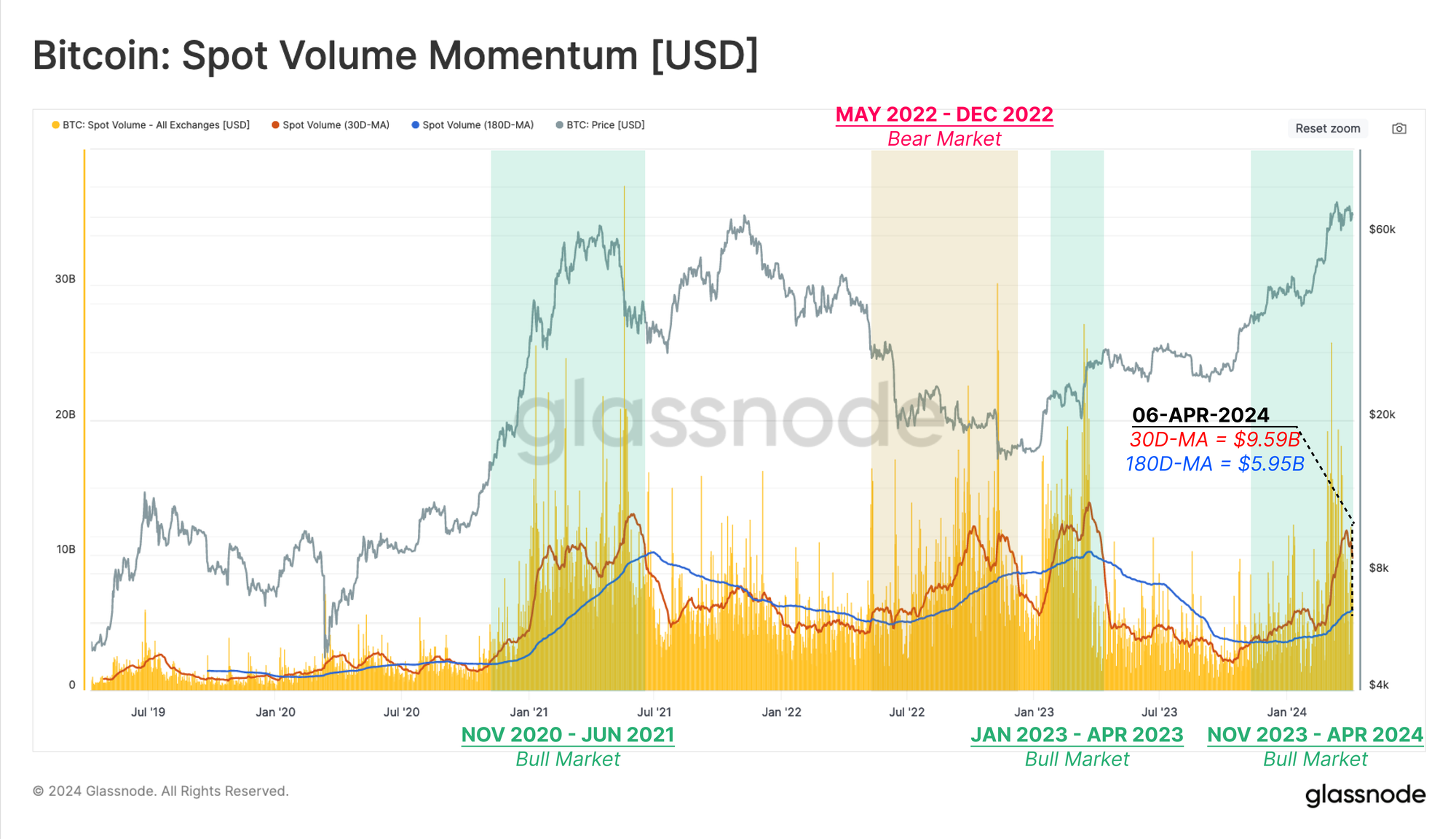 To assess overall market momentum, we can employ a simple slow/fast-moving average model applied to spot volumes. Here, we compare the 180D-MA (slow) and 30D-MA (fast) to assess whether spot trade volumes are warming up or cooling down.