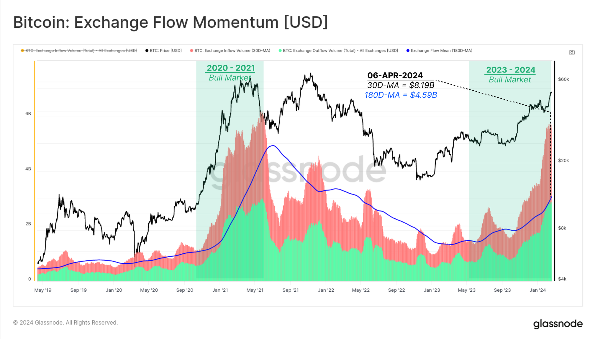 We can see a similar positive momentum signal to what has been in play since July 2023, suggesting the flow of coins in and out of exchanges is also heightened. The monthly average of total Exchange Flows (inflows plus outflows) is currently at $8.19B per day, significantly higher than the peak in the 2020-2021 bull market.