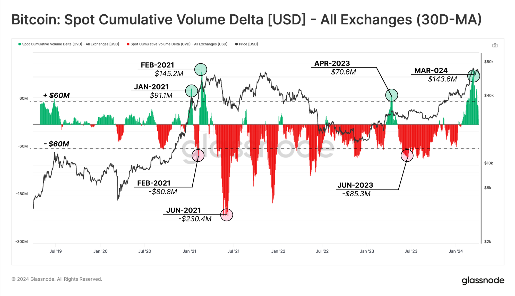 Suppose we isolate the major positive peaks 🟩, where the taker buy volume minus the taker sell volume exceeds $60M. In that case, we can see a remarkable similarity between market sentiment in Q1-2021 and the post-ETF market.