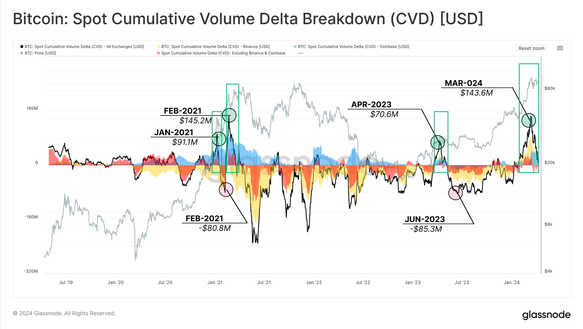 - By inspecting the cumulative volume delta (CVD), we can see that a majority of 2023 saw net selling activity on the taker side, even though corrections have been historically mild and less than 20%.
