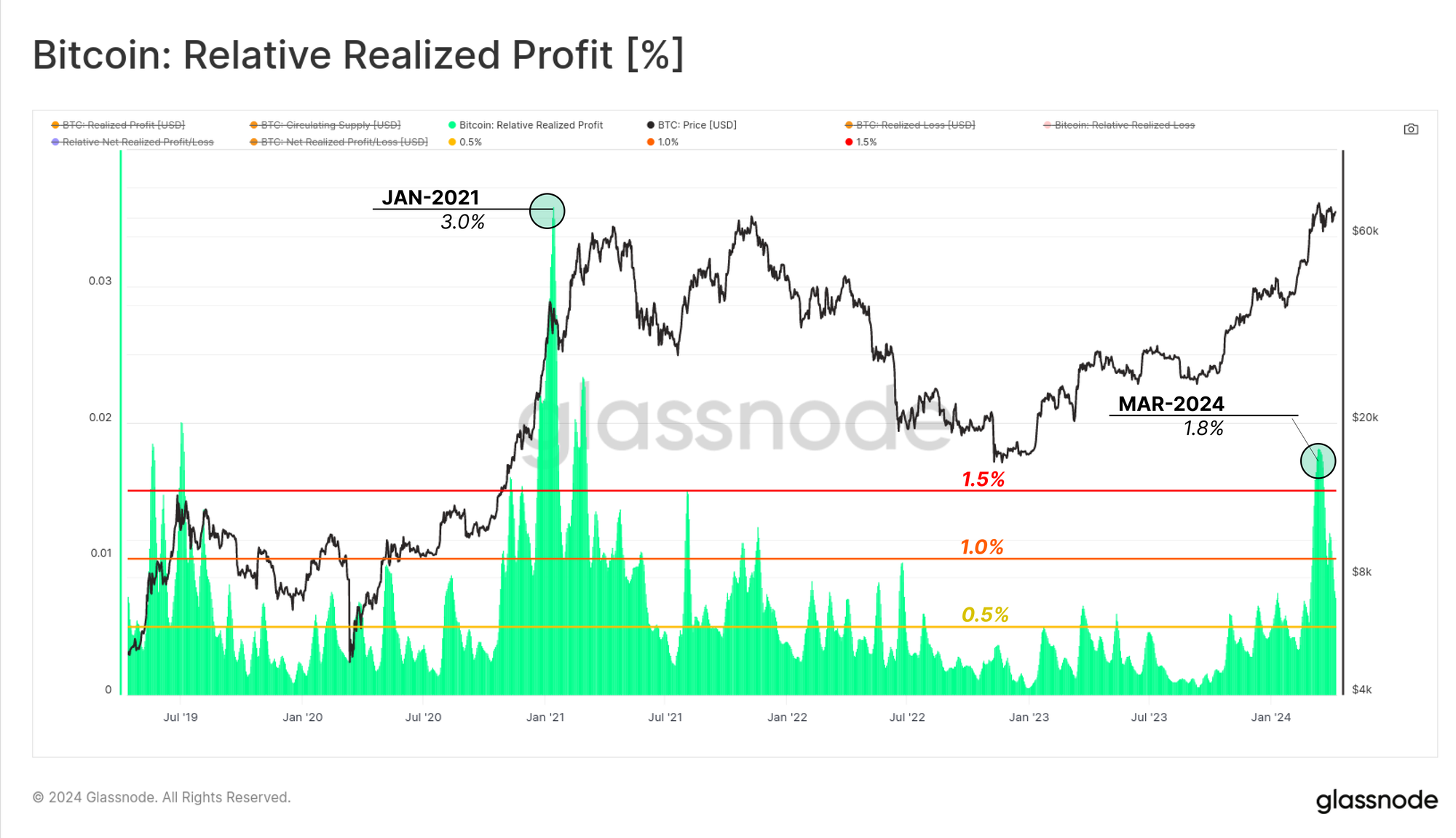 As the market reclaimed the 2021 cycle high, this metric peaked at 1.8%, suggesting 1.8% of the market cap was locked in as profit over a 7-day period. This is significant but remains comparatively lower than the profit-taking intensity during the January 2021 rally (3.0%.)