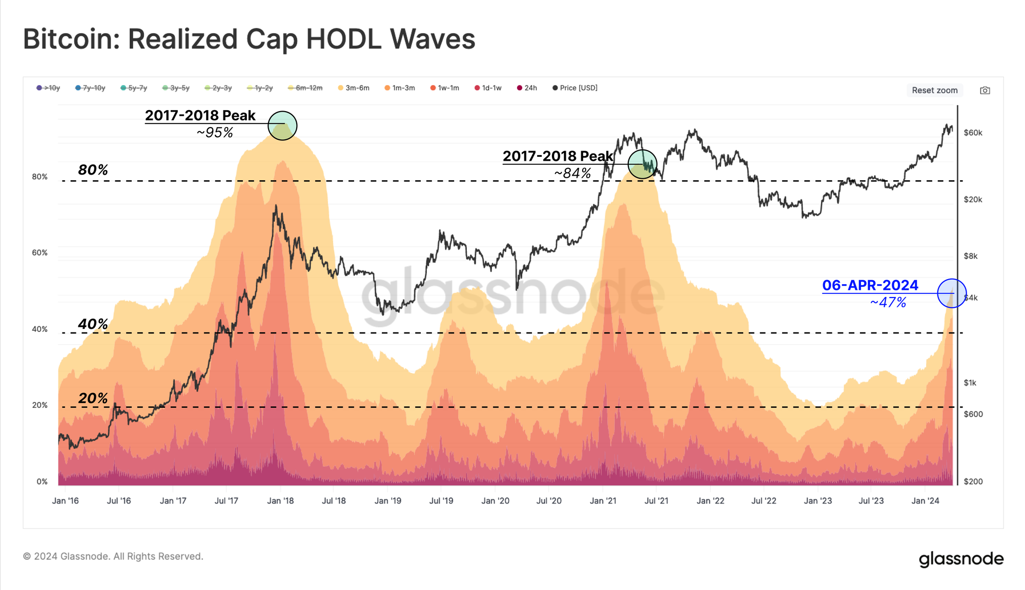 During the last two bull markets, the aggregate share of < 6-month-old wealth reached between 84% and 95%, indicating a saturation of newer holders. This metric has increased dramatically since early 2023, rising from 20% on 1-Jan-2023 to 47% today.