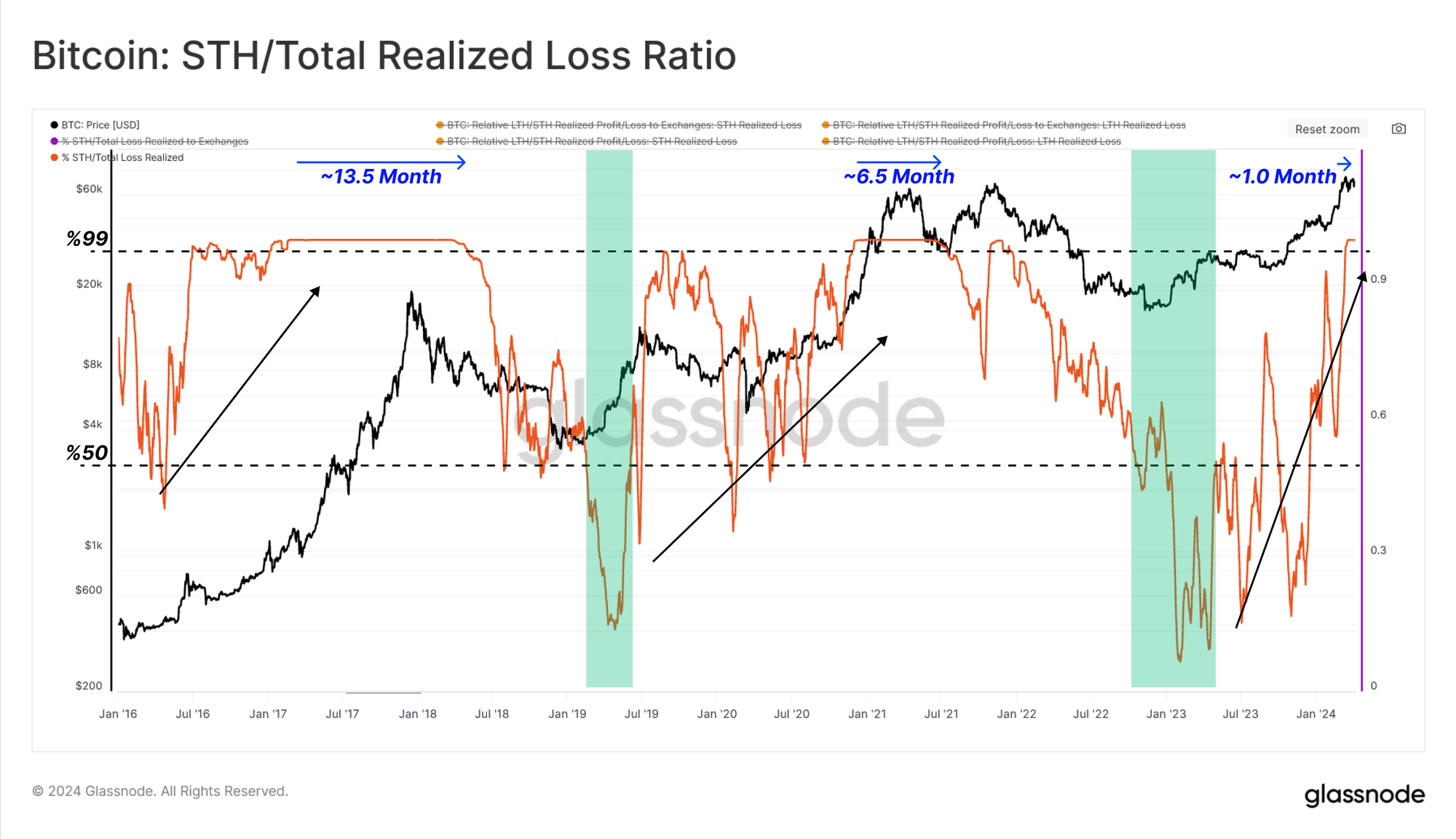 If we consider this ‘STH Loss Dominance’ across prior cycles, we can see that this condition has lasted for between 6.5 and 13.5 months until the bear market sets in. The current market has only entered this condition for around 1-month so far.