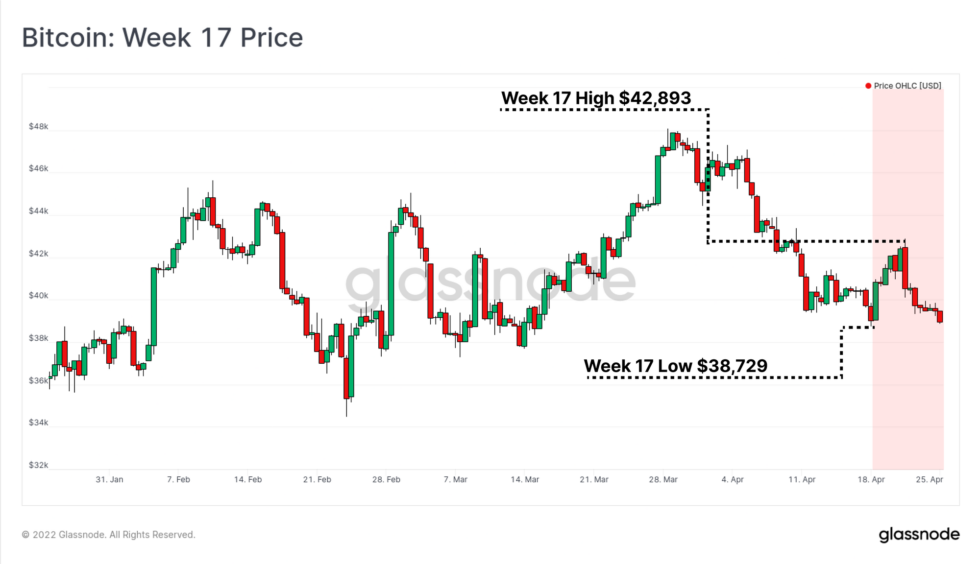 Volatility and trading volume continues to compress across the Bitcoin market, as prices remain bound within the $38k to $42k consolidation range. Market prices weakened slightly again this week, trading off a high of $42,893, and losing ground at a weekly low of $38,729.