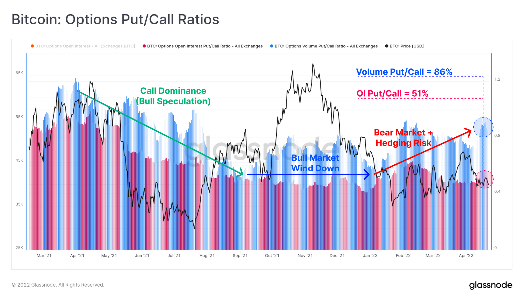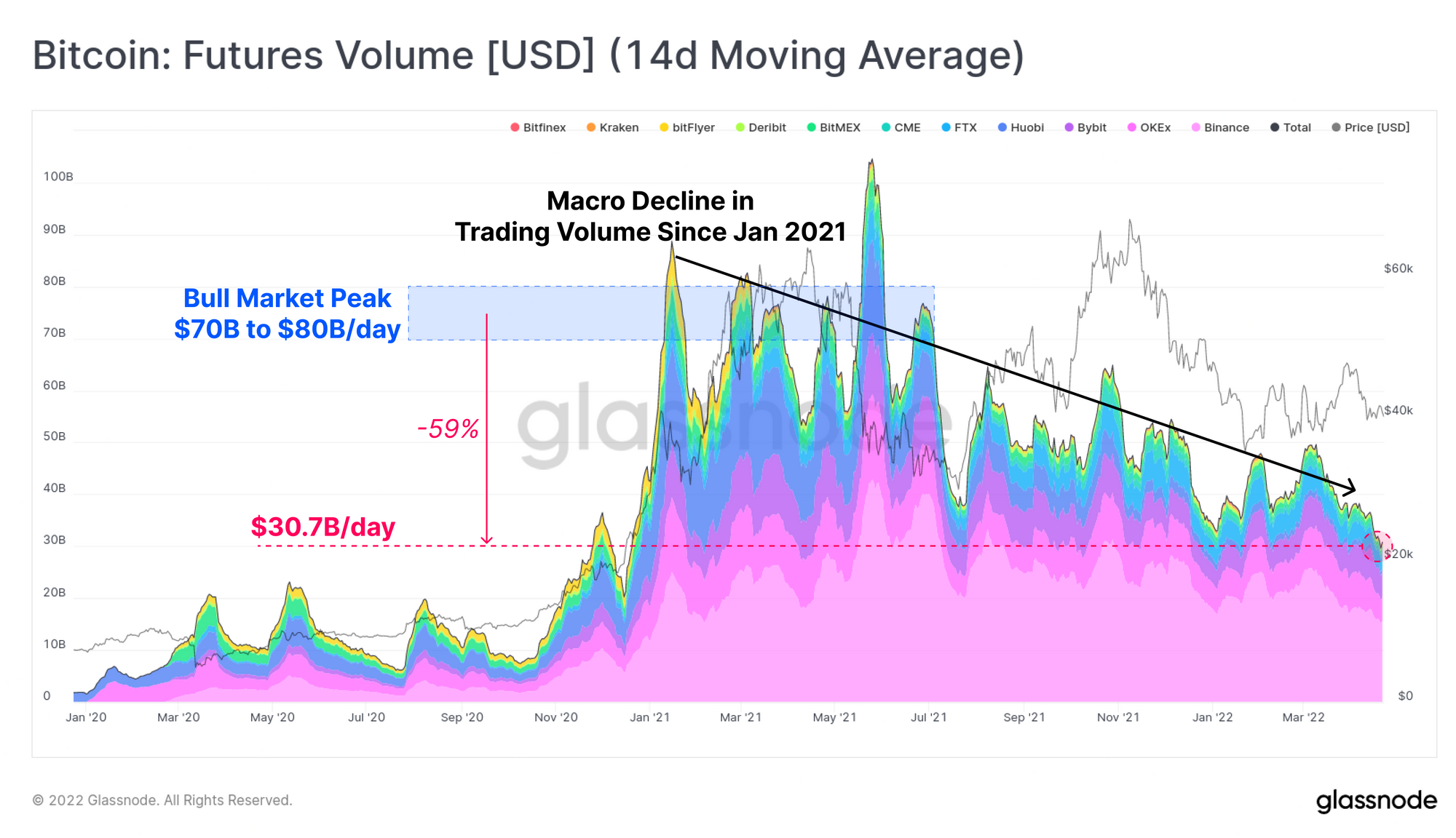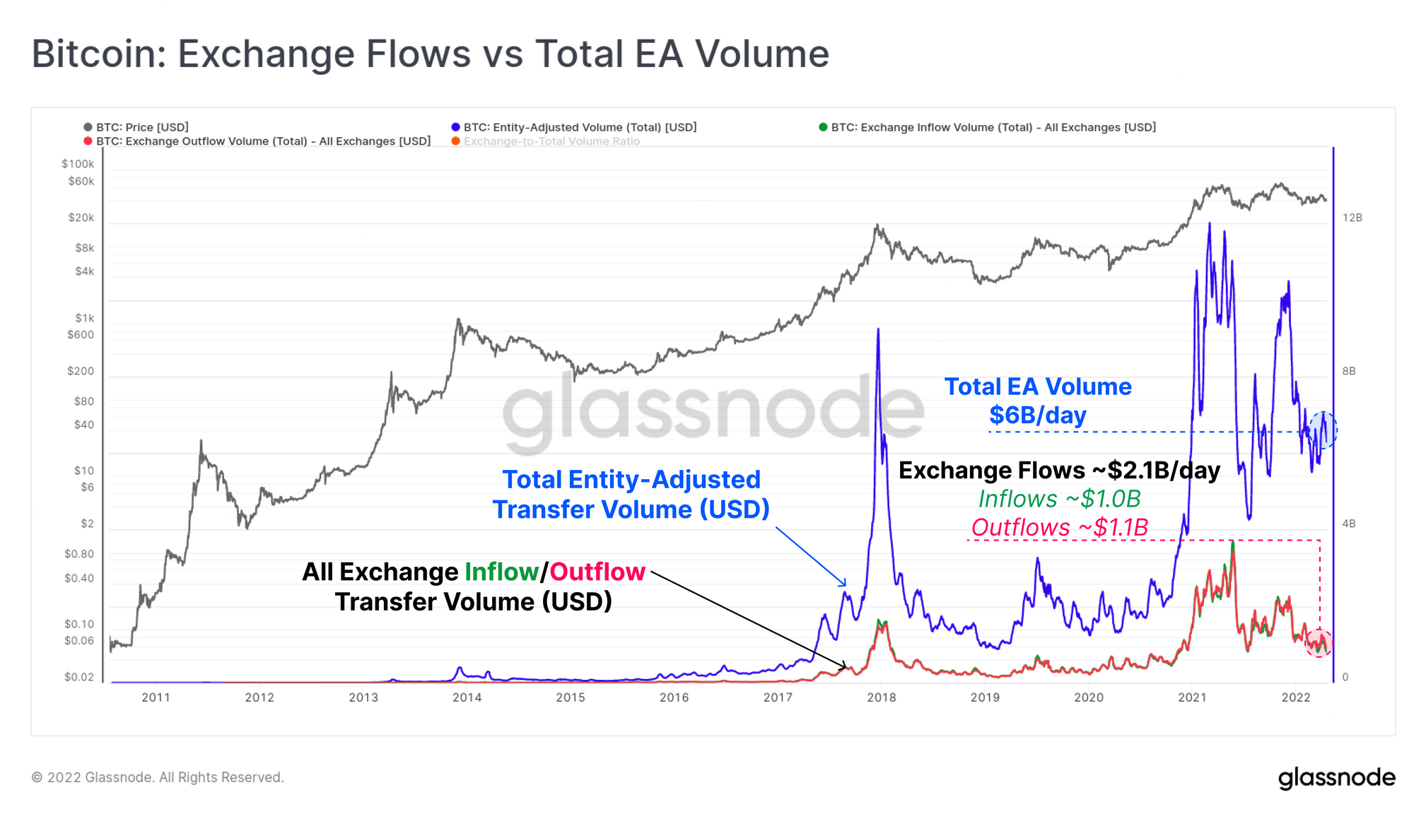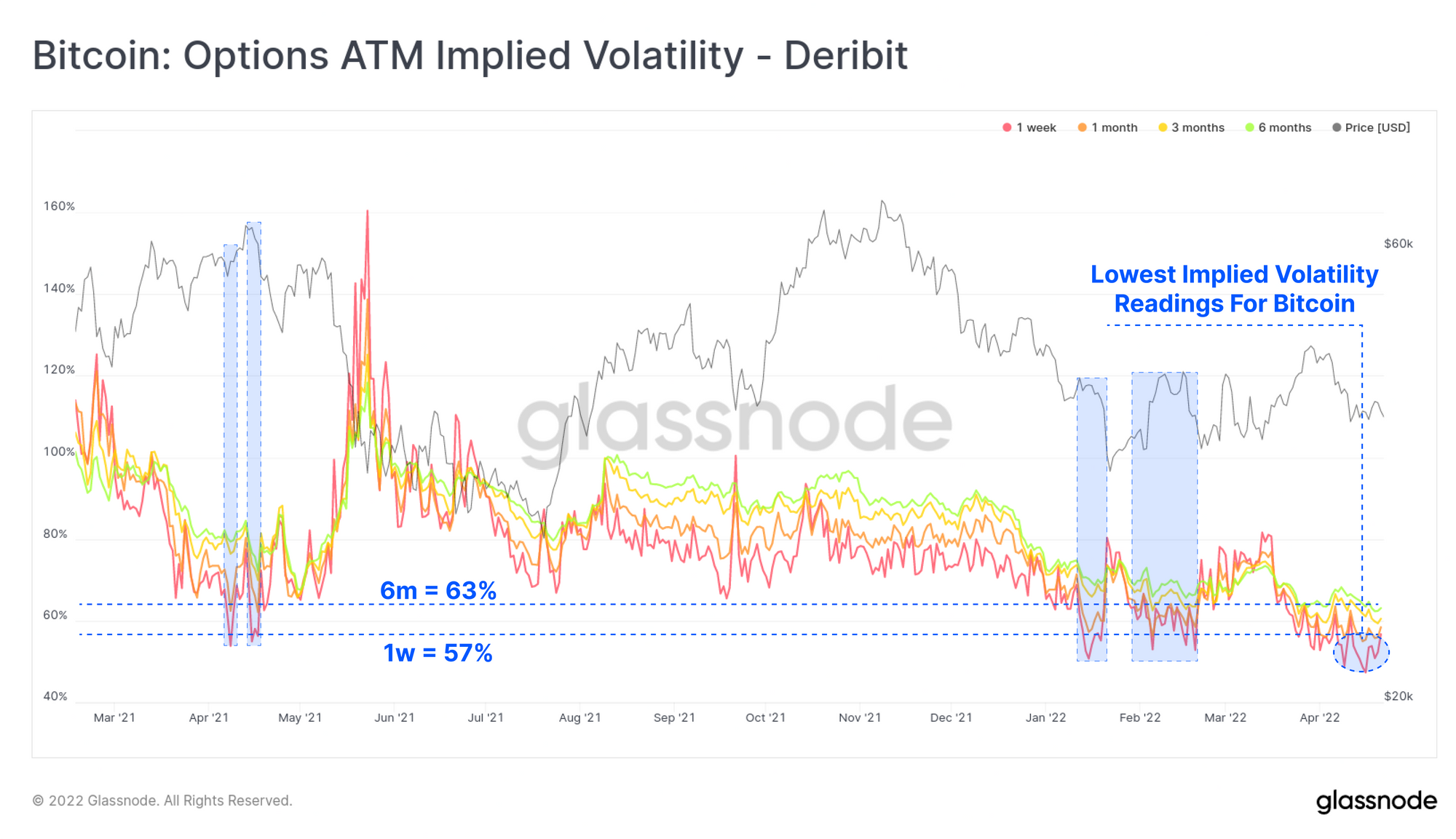 The market has now traded within an increasingly tight price range for almost three months, leading to historically low yields available in futures markets cash-and-carry trades, alongside a persistent decline in trade volumes. Implied volatility priced into options markets has also broken below 60% this week, which is significantly lower than the 80%+ volatility that characterised much of 2021. Furthermore, transaction volumes on-chain remain muted, albeit with a growing trend of high value ($10M+) transactions, and a macro decline in volumes associated with exchange inflows and outflows.