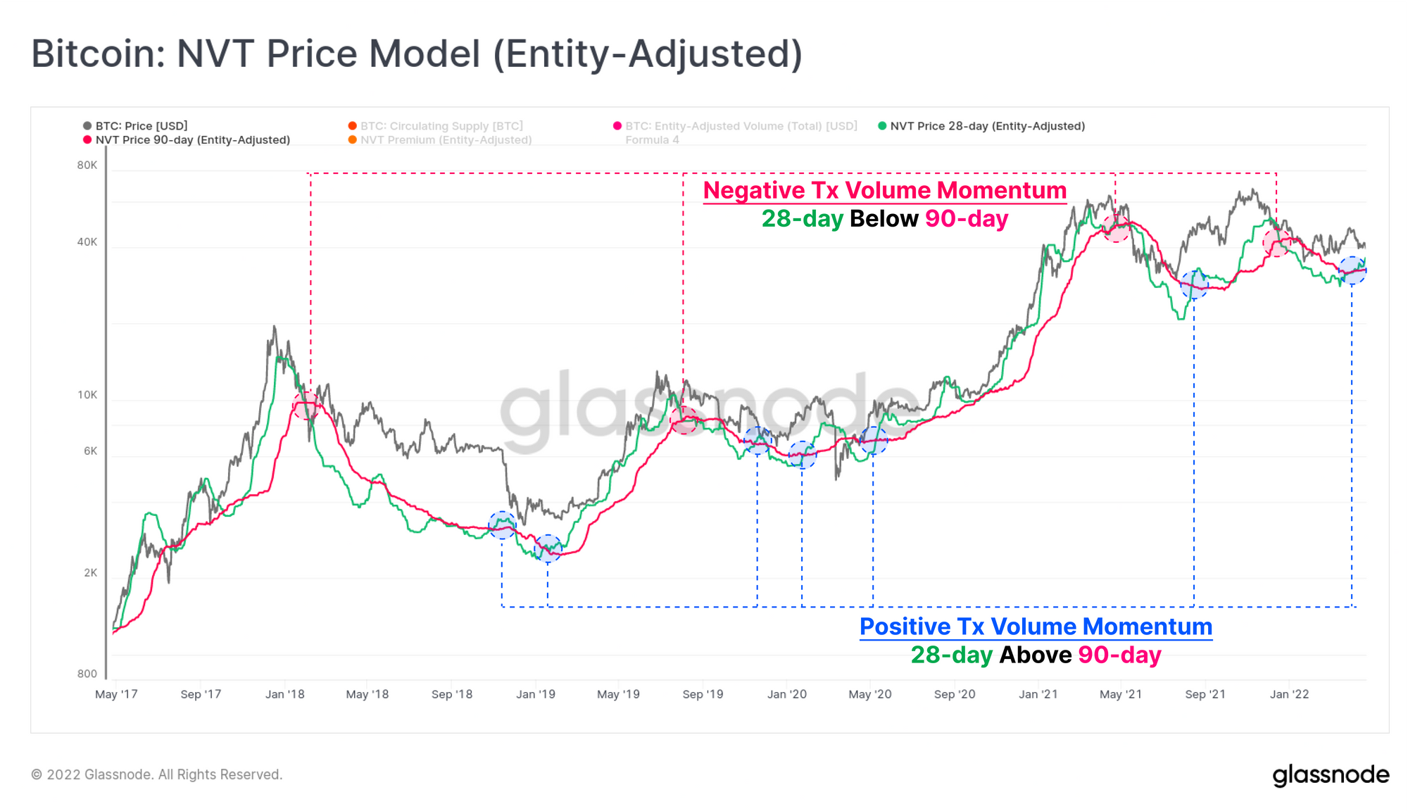 - Cyclical divergence between exchange related inflow/outflow volume, and total transaction volume. This accompanies a potential shift in momentum with respect to network utilisation, and provides a potentially constructive reversal in the fundamentally implied valuation for Bitcoin.