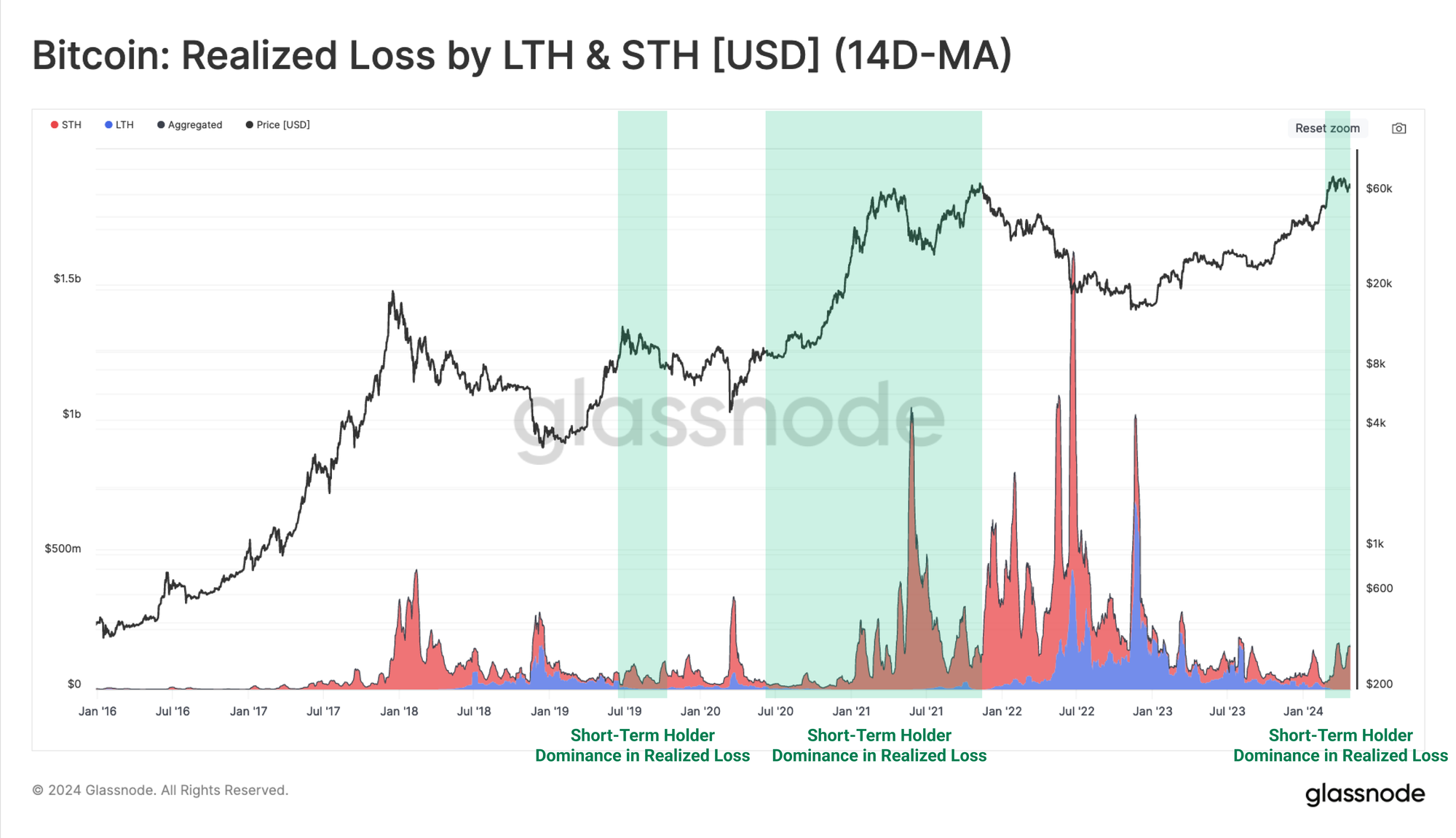 We can use the Realized Loss breakdown metric (denominated in USD) to identify that short-term holders (recent buyers) are displaying a marked dominance at the moment.
