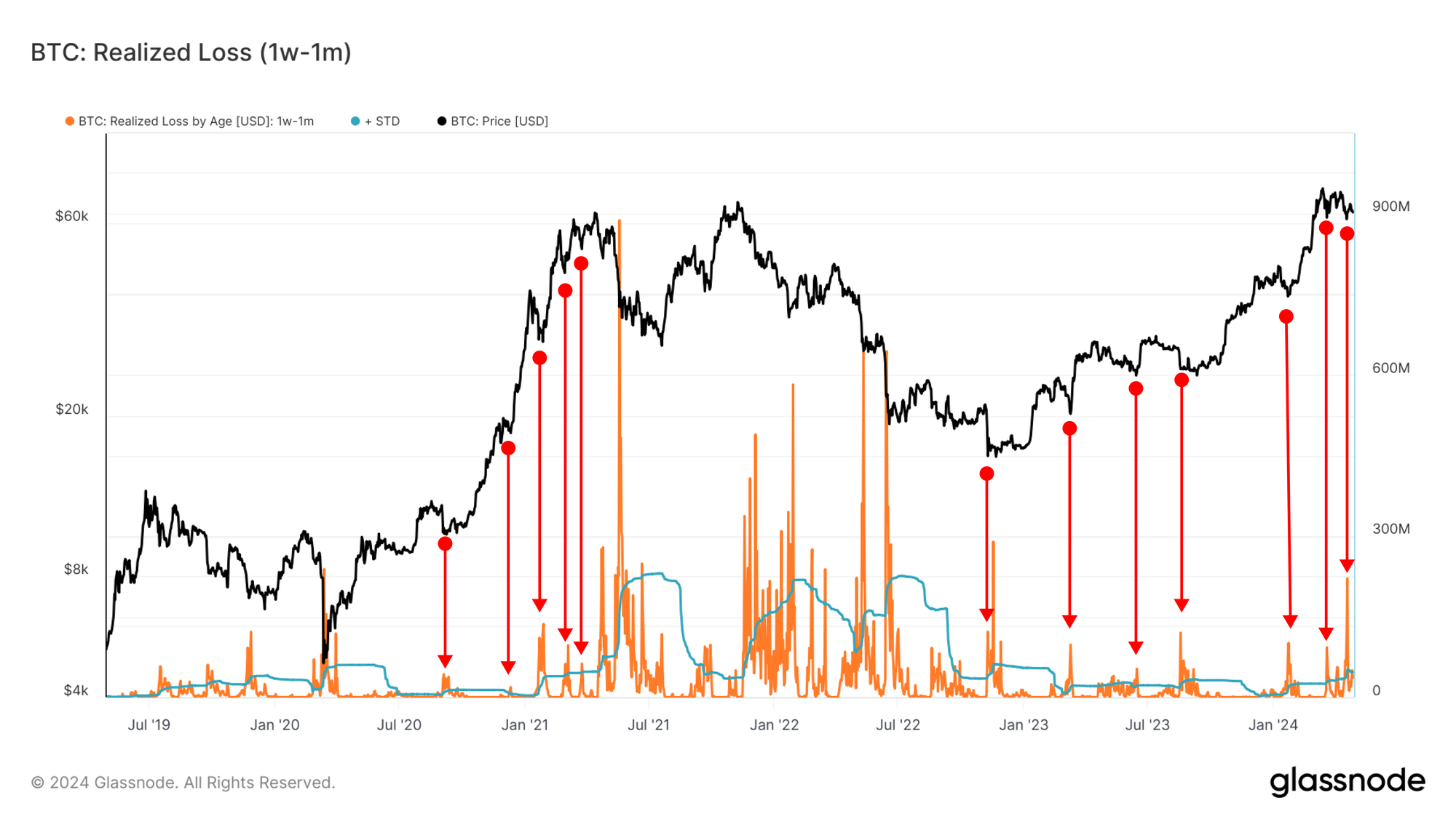 Here, we have presented the realized loss by 1w-1m old entities, denominated in USD. Next, we have identified points of high-loss realization intervals using some simple statistical means ( > 1 standard deviation).