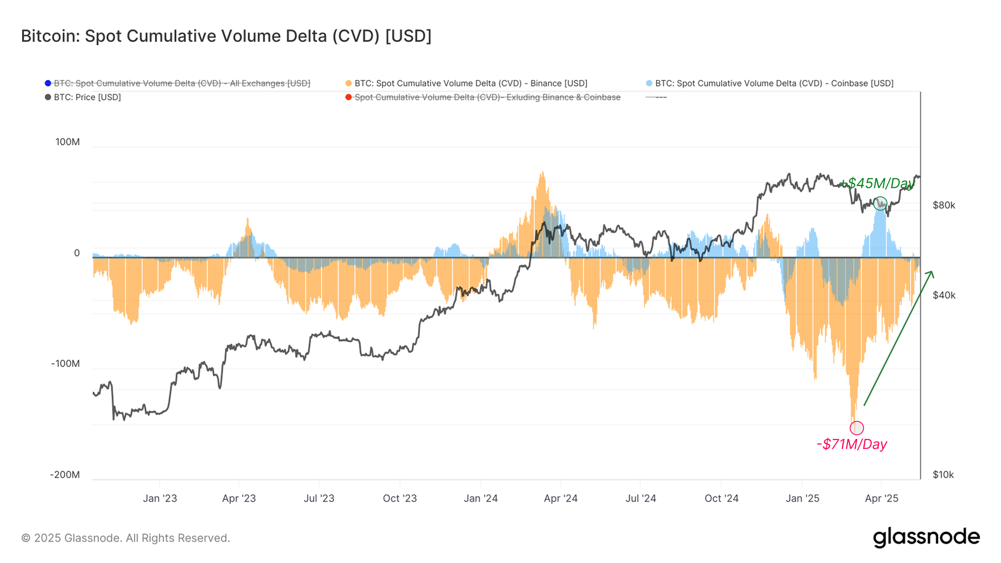 The chart below highlights the spot CVD metric for Binance and Coinbase. Since mid-April, Coinbase has experienced a regime of consistent net buying, with CVD peaking at +$45M per day, aligning with the acceleration of the market higher. In contrast, Binance markets have transitioned from an intense net selling pressure of -$71M per day in mid-March, to a milder -$9M daily today, reflecting a notable cool-down in sell-side pressure.