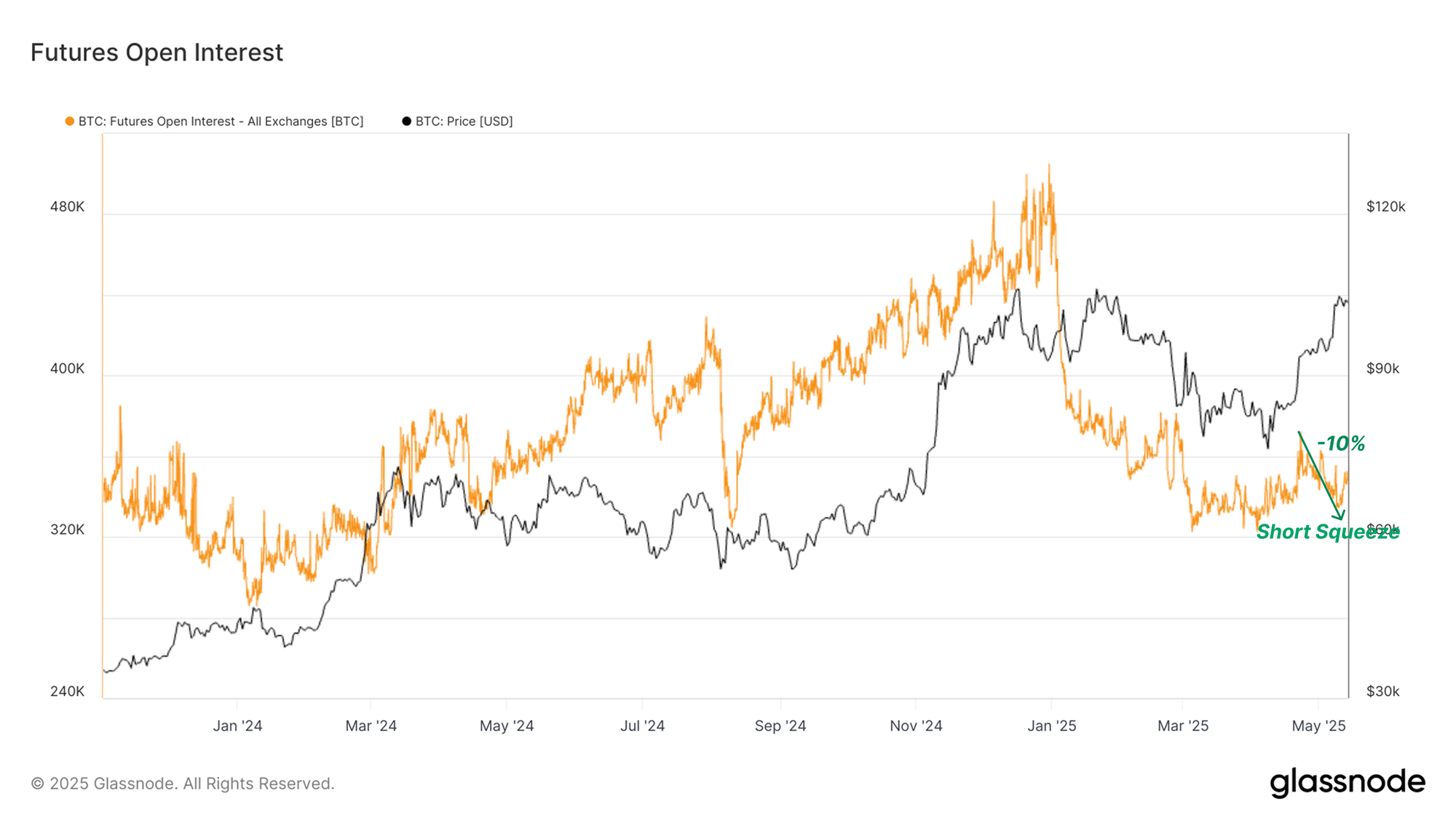 As leveraged short positions were flushed out, futures open interest has declined by -10%, dropping from 370k BTC to 336k BTC. This reduction gives us a sense of scale for how large the short squeeze was. This process also lessens the probability of an unhealthy deleveraging event, and likely softens the potential for volatility in near-term price action.