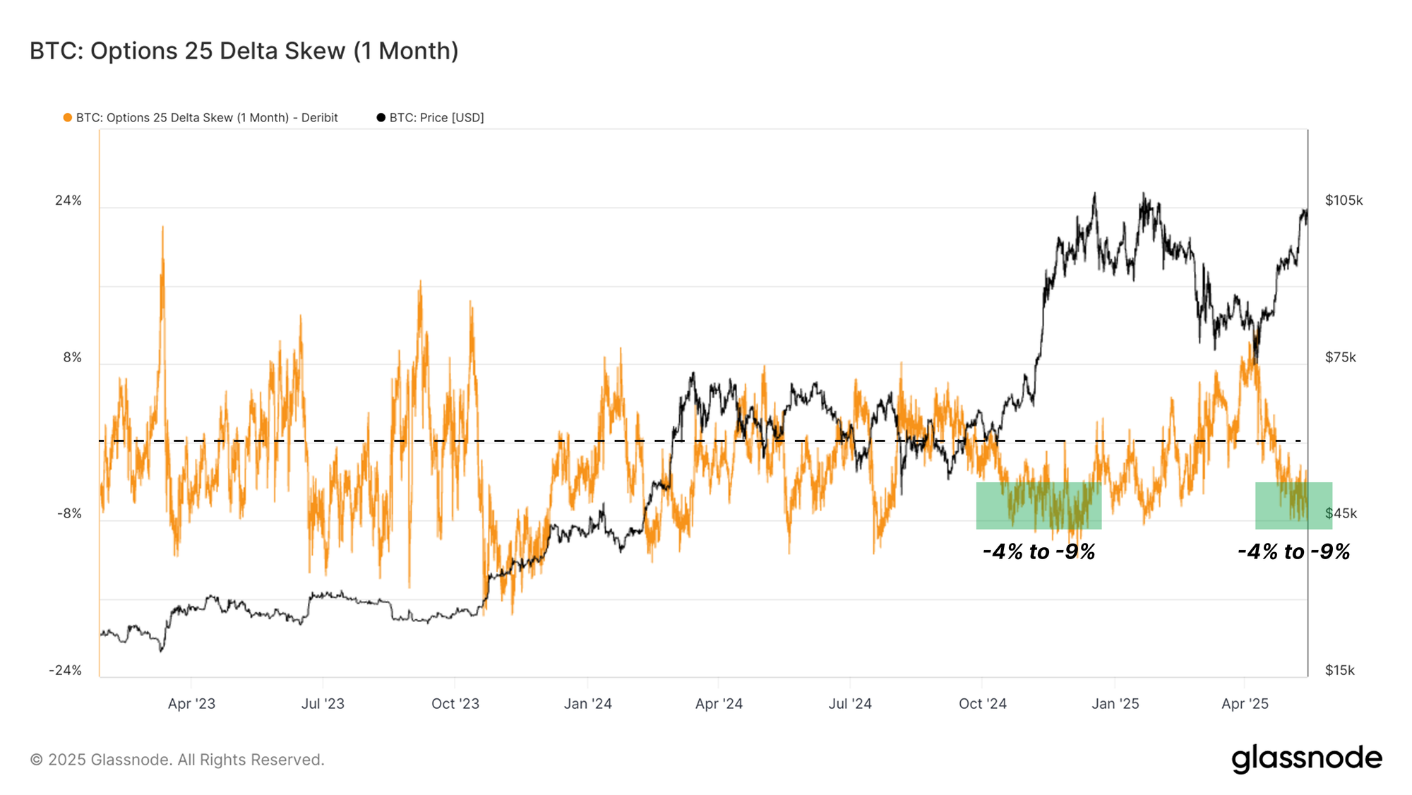 A complementary lens into market sentiment can be found in options market data, specifically through the 1-Month 25 Delta Skew. This metric is calculated as the implied volatility (IV) of 25-delta puts minus the IV of 25-delta calls. A negative skew, therefore, indicates that calls are more expensive than puts, suggesting that traders are speculating more aggressively on upside movement, often a sign of underlying bullish sentiment.