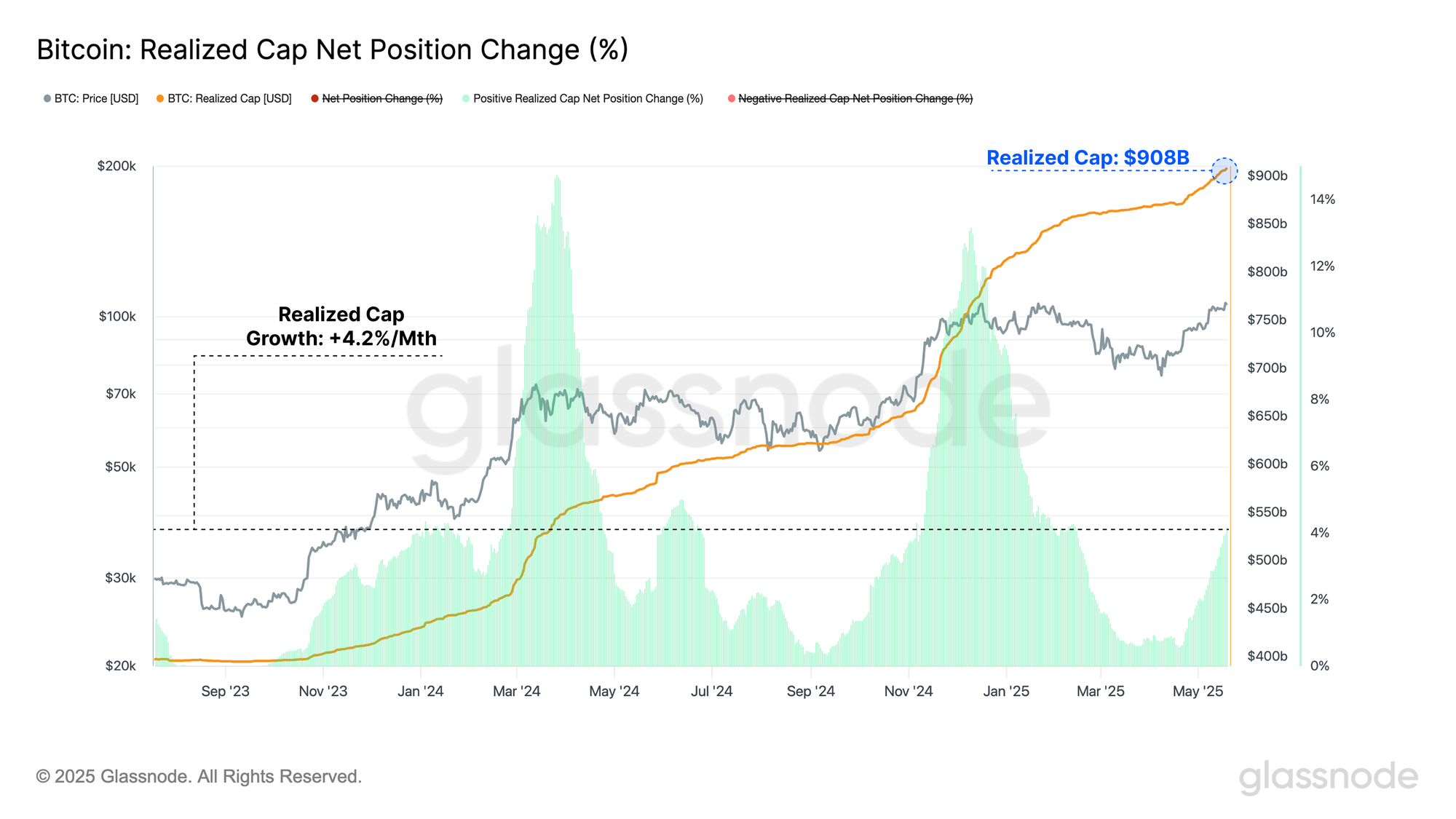 - Bitcoin has reached a local high of $107K, remaining within close range of its ATH of $109K set in Dec 2024. This has driven a notable increase in capital inflows, pushing the Realized Cap above $900B for the first time, a historic milestone.