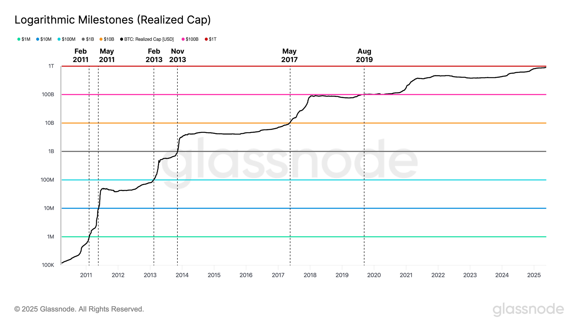 With a $1T milestone for the Realized Cap on the horizon, we can track how capital flows have accrued in the Bitcoin network over its 16-year history. The chart below illustrates the duration between each log-scale milestone that the realized cap has surpassed over time: