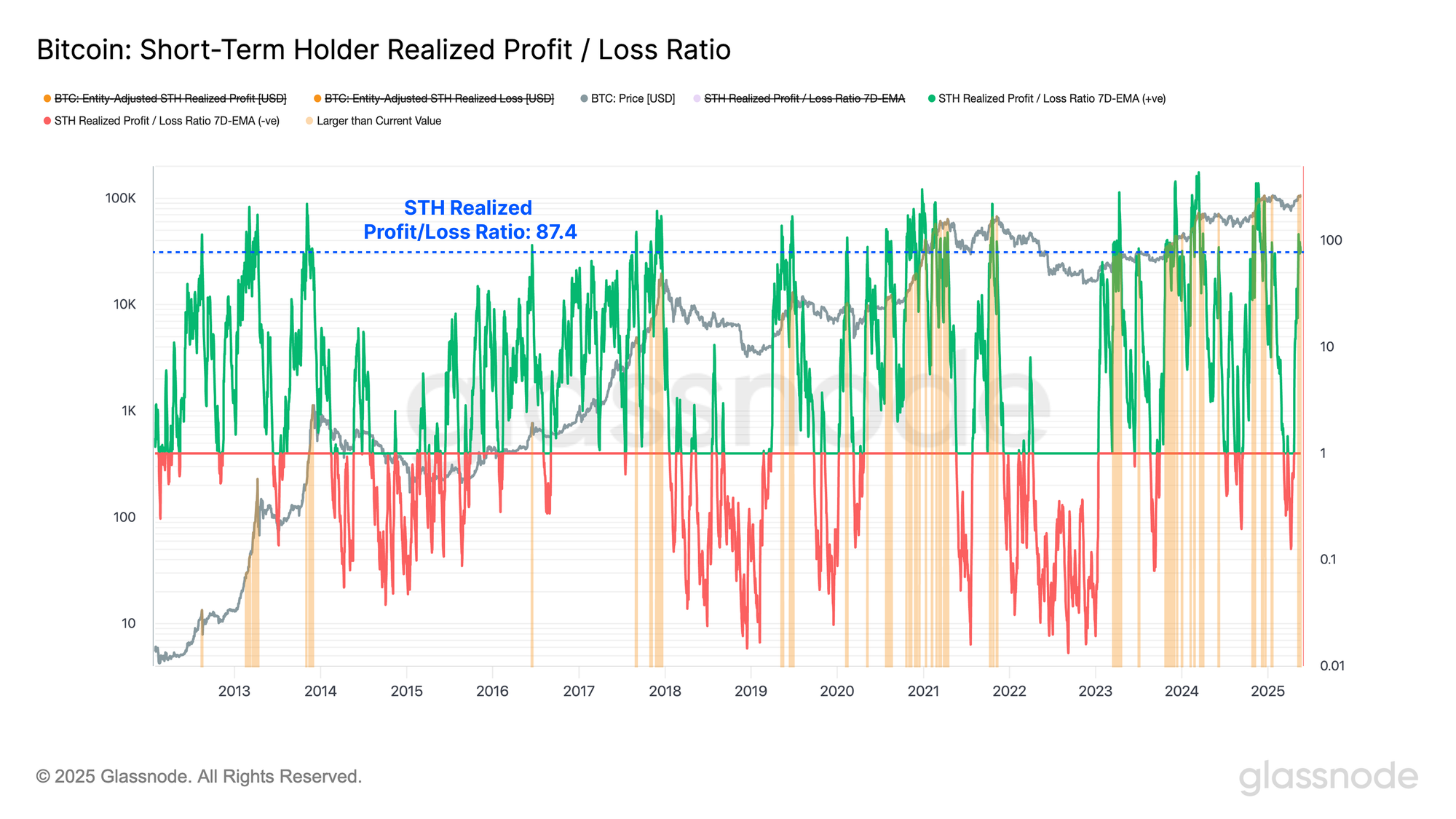 This shift has caused a major spike in the Short-Term Holder Realized Profit/Loss Ratio. Realized profit volumes for Short-Term Holders now massively outweigh realized losses, such that only 8% of trading days have seen the P/L Ratio at a higher level.