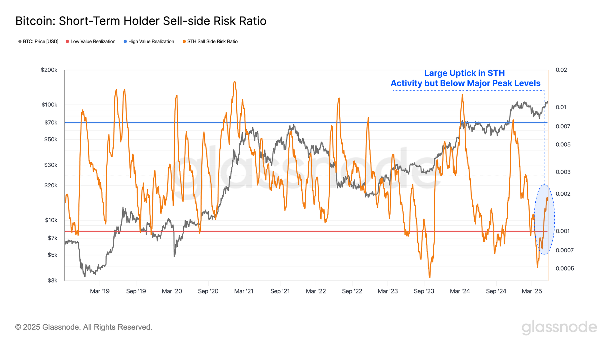 For the Short-Term Holder cohort, we can see a sharp uptick in their Sell-Side Risk Ratio, although it remains significantly below levels often seen around major peaks. This suggests there may still be room for the market rally to continue, as investors are not yet locking in excessive profits relative to their total holdings.