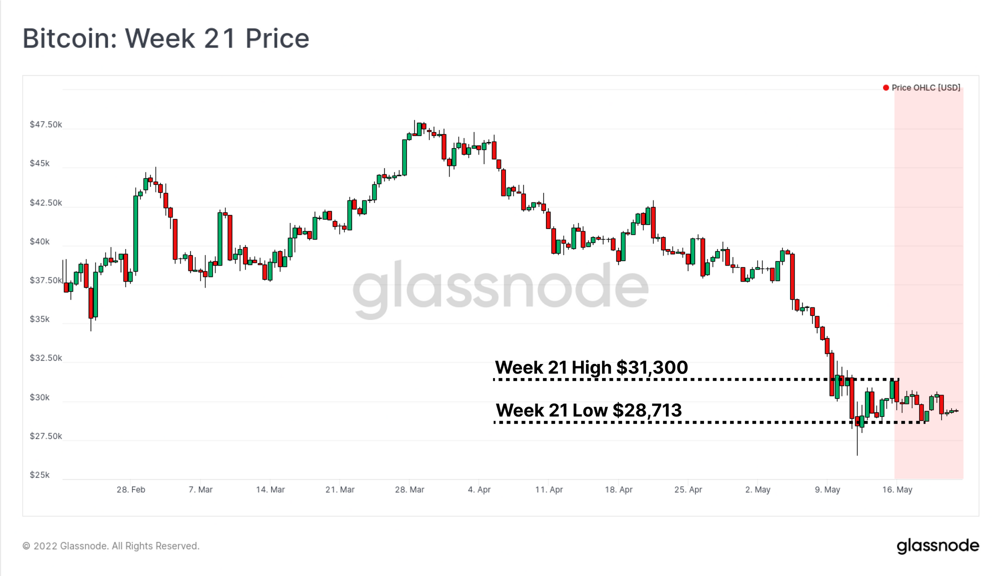 After the industry-wide sell-off alongside the collapse of LUNA and UST last week, markets have entered a period of consolidation. Bitcoin prices traded within a relatively tight range between a high of $31,300 and a low of $28,713.