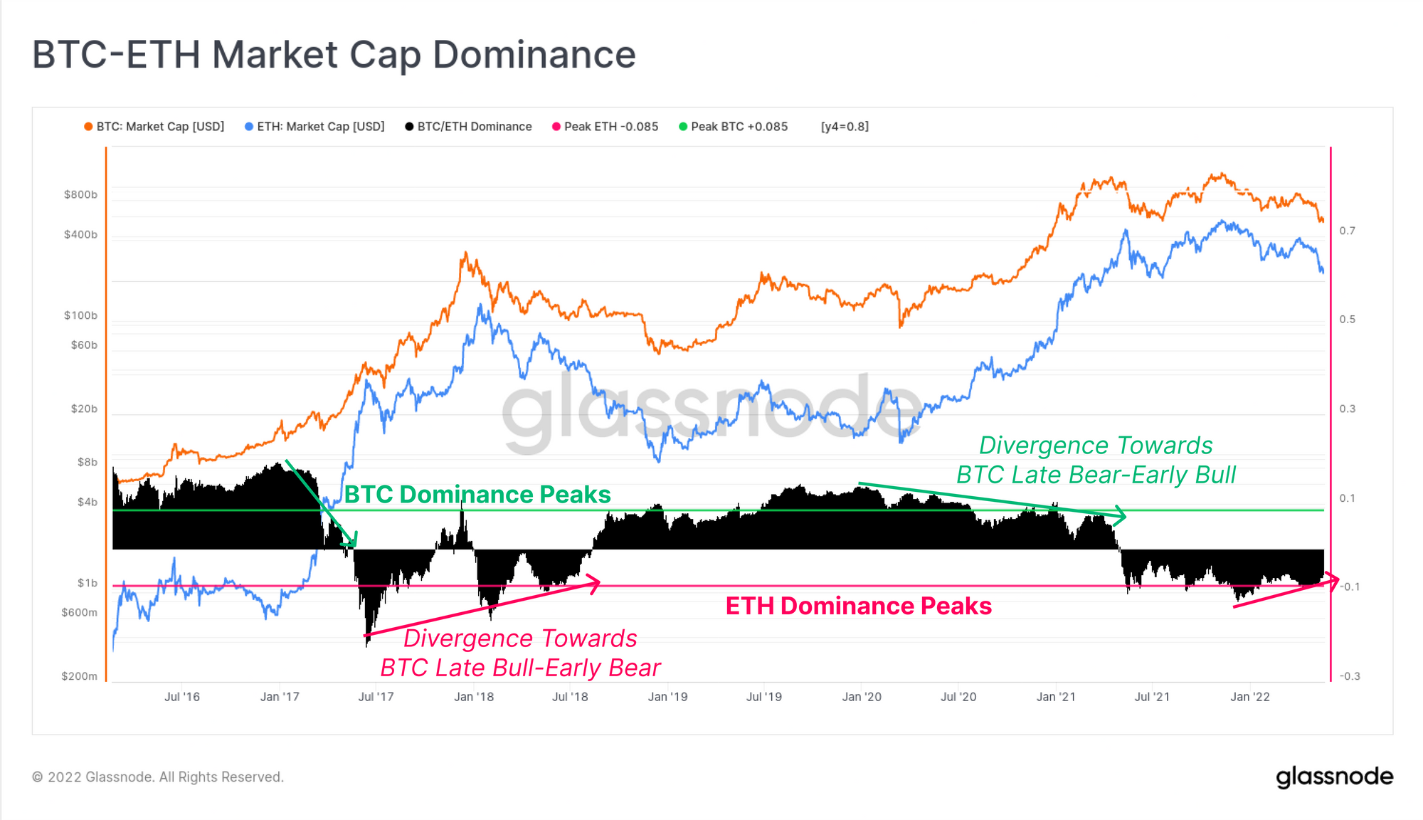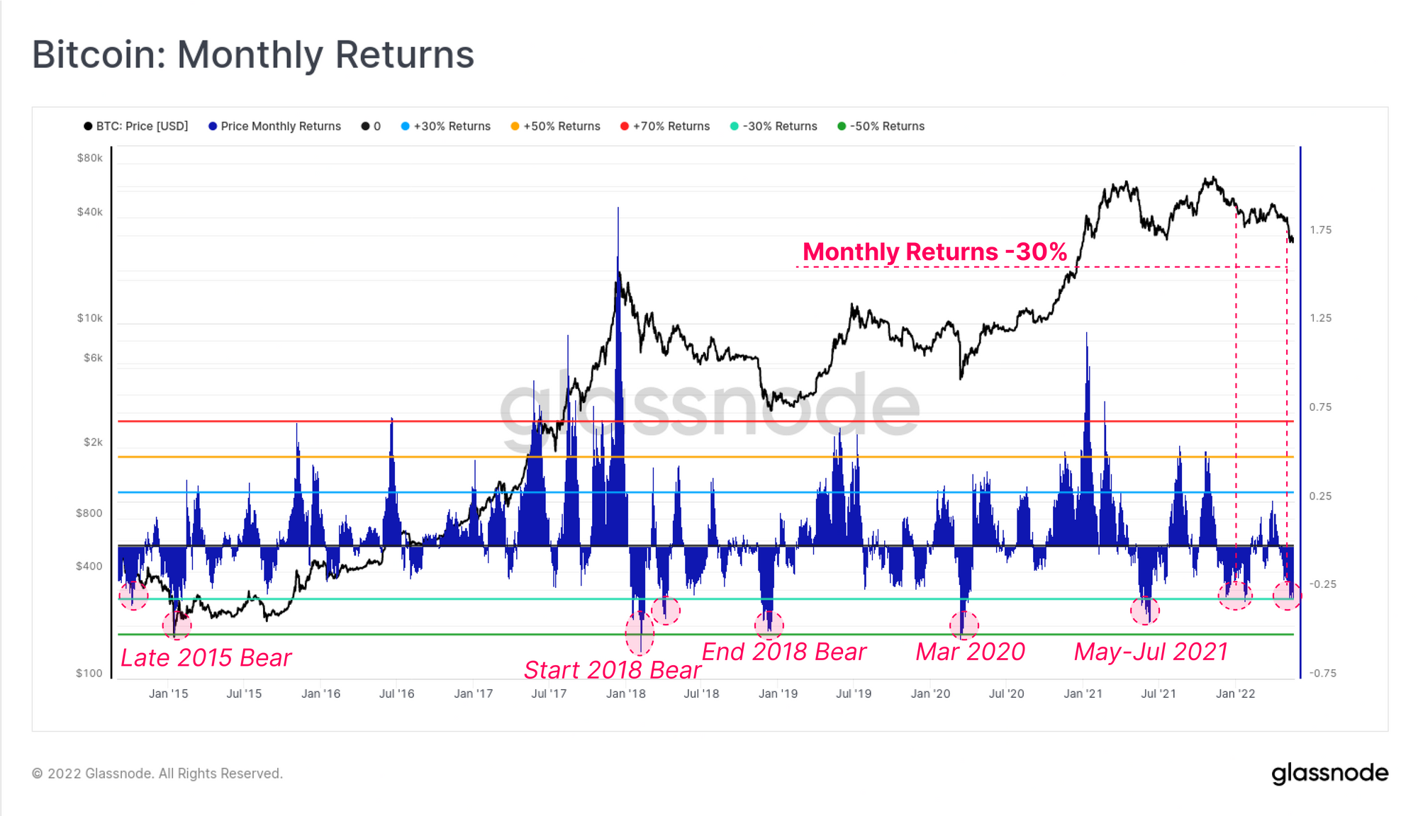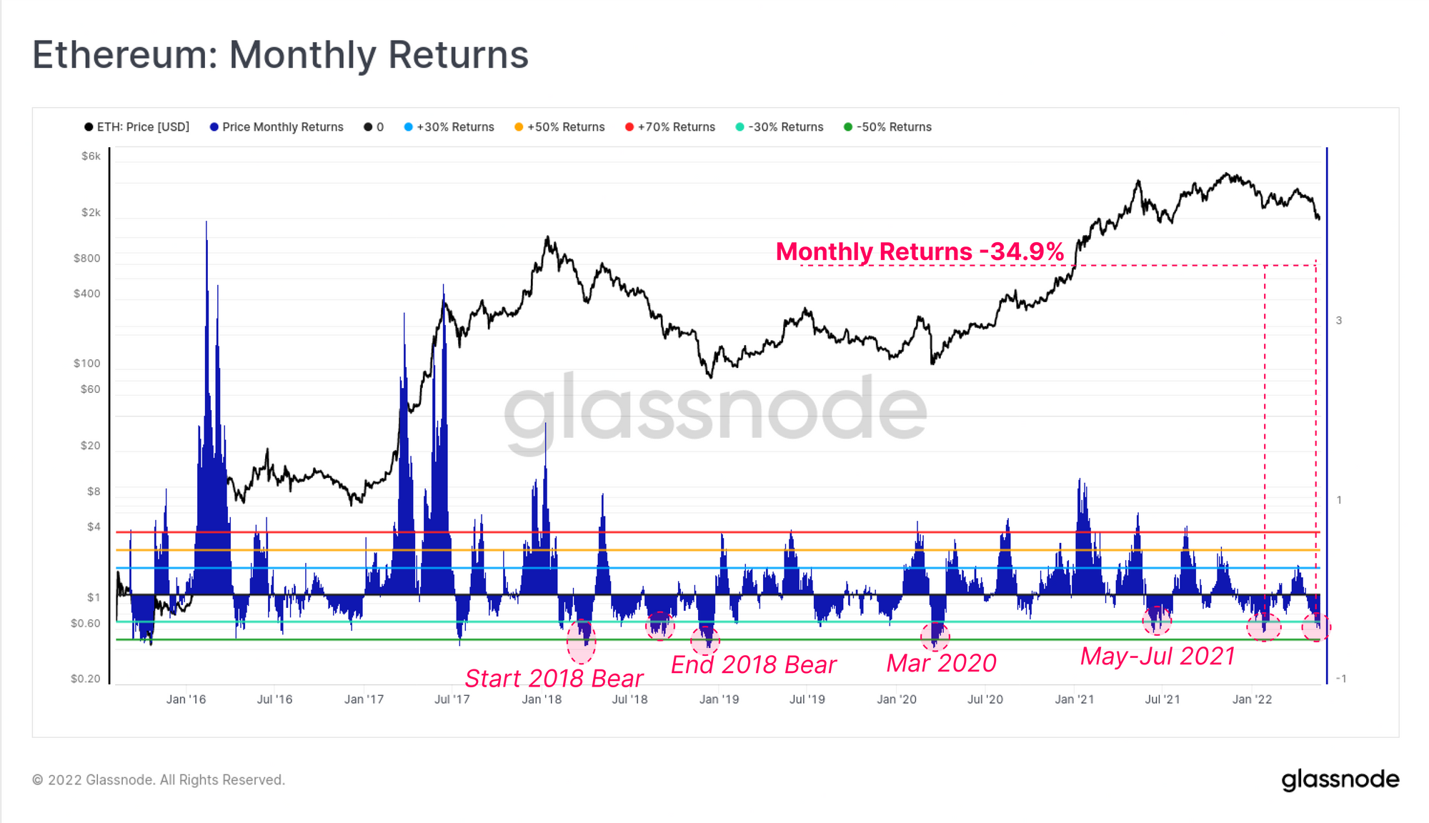 The Bitcoin market has now traded lower for eight consecutive weeks, which is now the longest continuous string of red weekly candles in history. This week we will look towards the return profile on both a short-term (monthly) and long-term (4yrs) basis for both Bitcoin and Ethereum. From this, we can see that the current drawdown has put a notable dent in the market performance of the asset-class as a whole.
