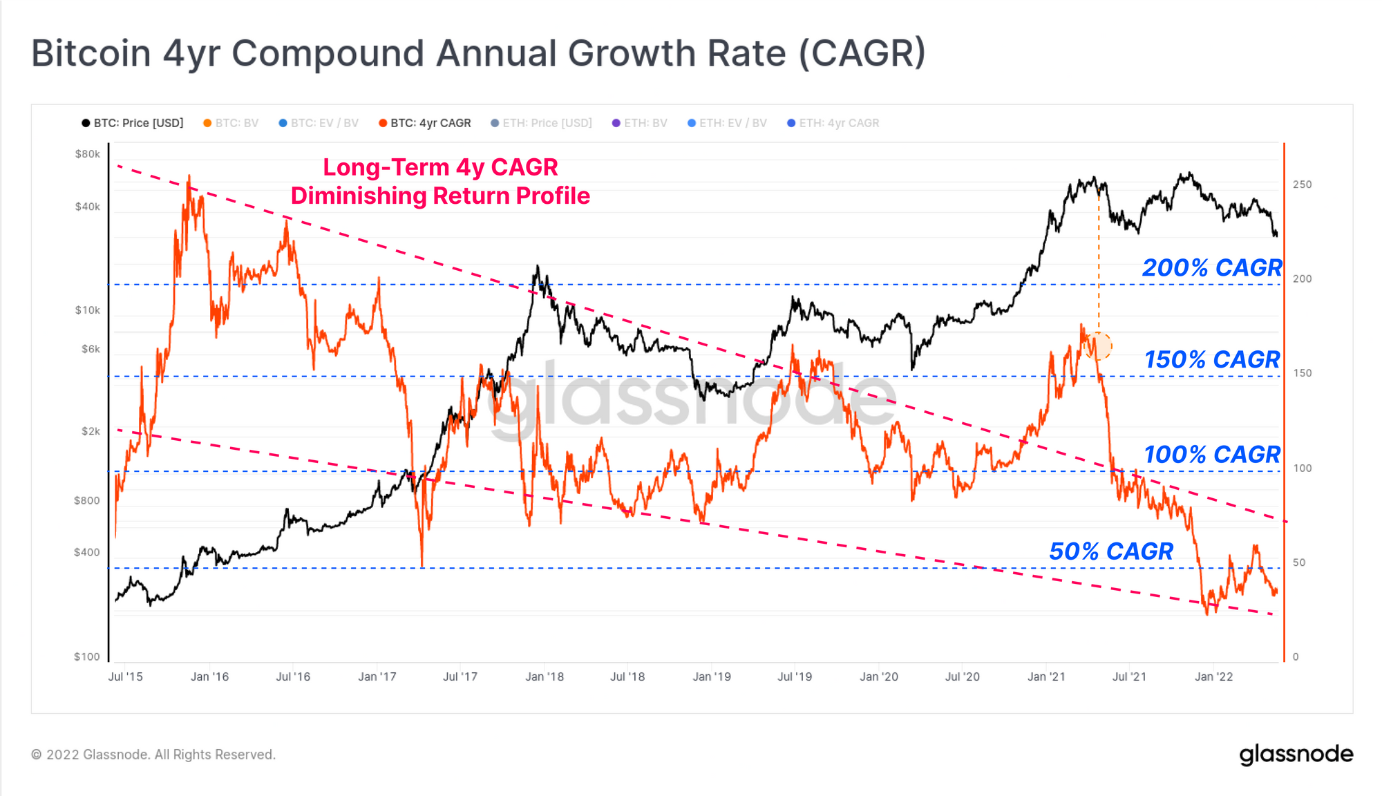 Price performance over the last 12 months has been nothing short of lacklustre, putting a dent in long-term CAGR rates for Bitcoin and Ethereum. This is supported by a dwindling demand for both chains blockspace, as expressed in on-chain fee markets.