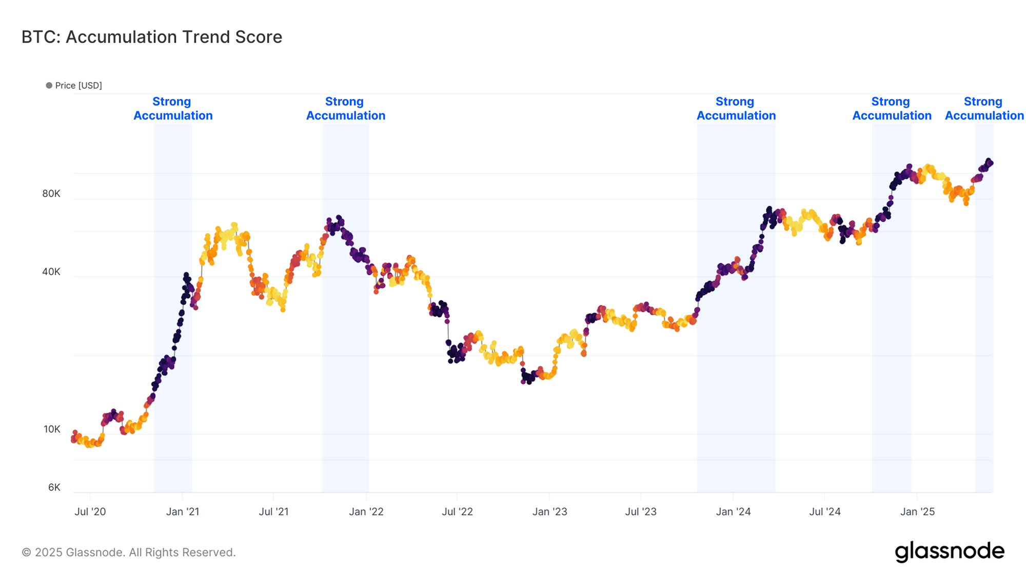 We can assess the accumulation patterns across various wallet sizes, and can see that new ATH tends to inspire a meaningful uptick in accumulation. This drives the Accumulation Trend Score up towards its highest value of 1.0.