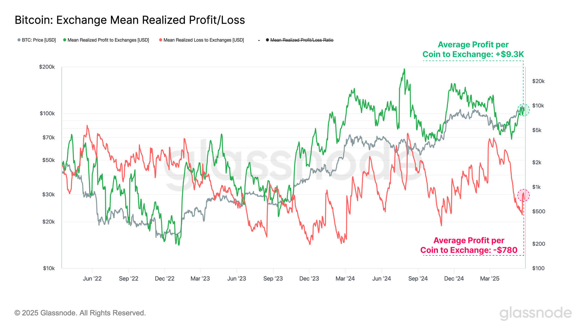 The average coin deposited to exchanges is currently realizing a profit of approximately +$9.3k, while coins moving at a loss are realizing an average loss of just -$780. This divergence indicates that the current spending behavior is overwhelmingly profit-driven, reflecting a notable improvement in investor sentiment.