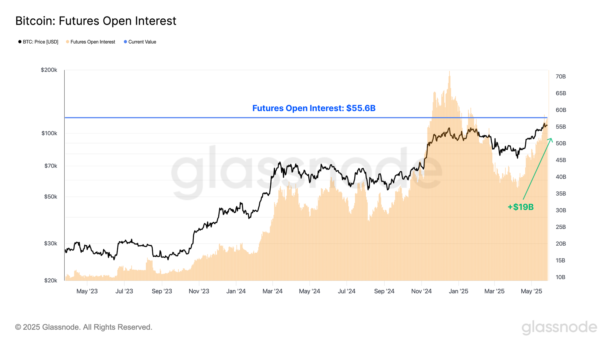 Open interest for futures contracts has seen marked growth since the $74k local low in April, expanding from $36.8B, to a current value of $55.6B. This reflects a +$19B increase (+51%) over the last 49 days alone, suggesting a build up of leverage is underway.