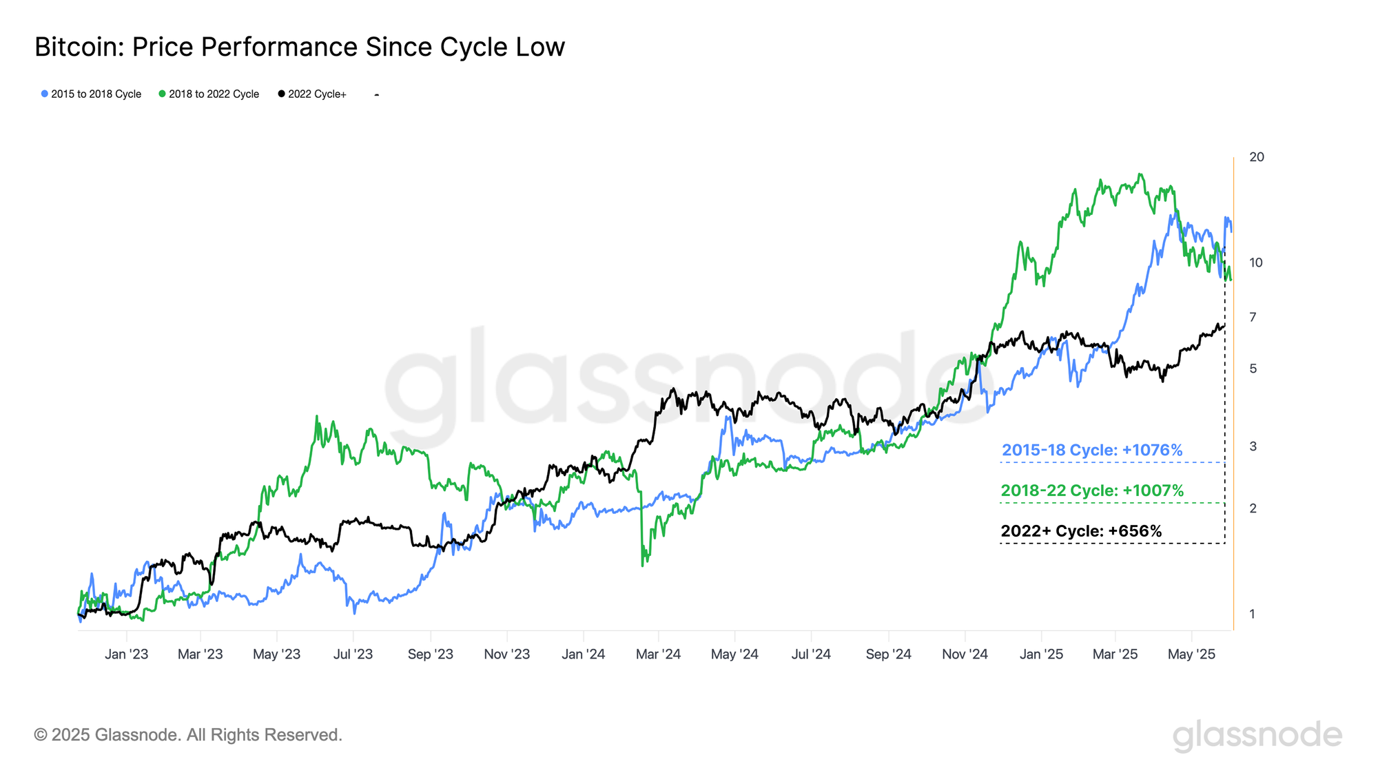 When we compare the price performances of the current cycle, to prior ones, we can see a surprising similarity in structure, despite Bitcoin being orders of magnitude larger in total Market Cap size. The chart below presents the index performance since the relative cycle low:
