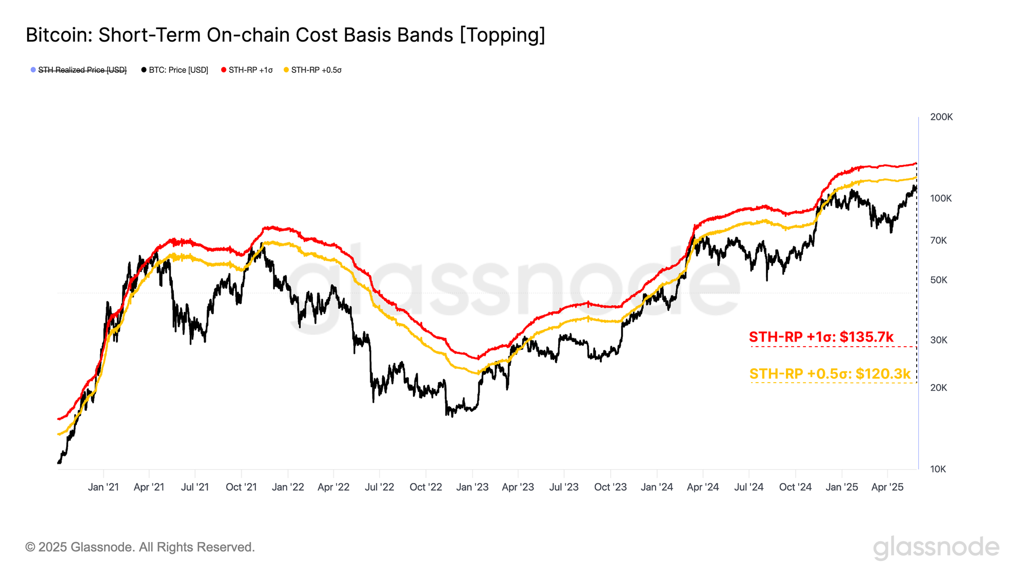 While the MVRV +1σ level is typically associated with macro tops, the STH-CB +0.5σ and +1σ bands are more indicative of local topping formations. Together, the combination of these models can provide a robust framework for identifying overheated market conditions.