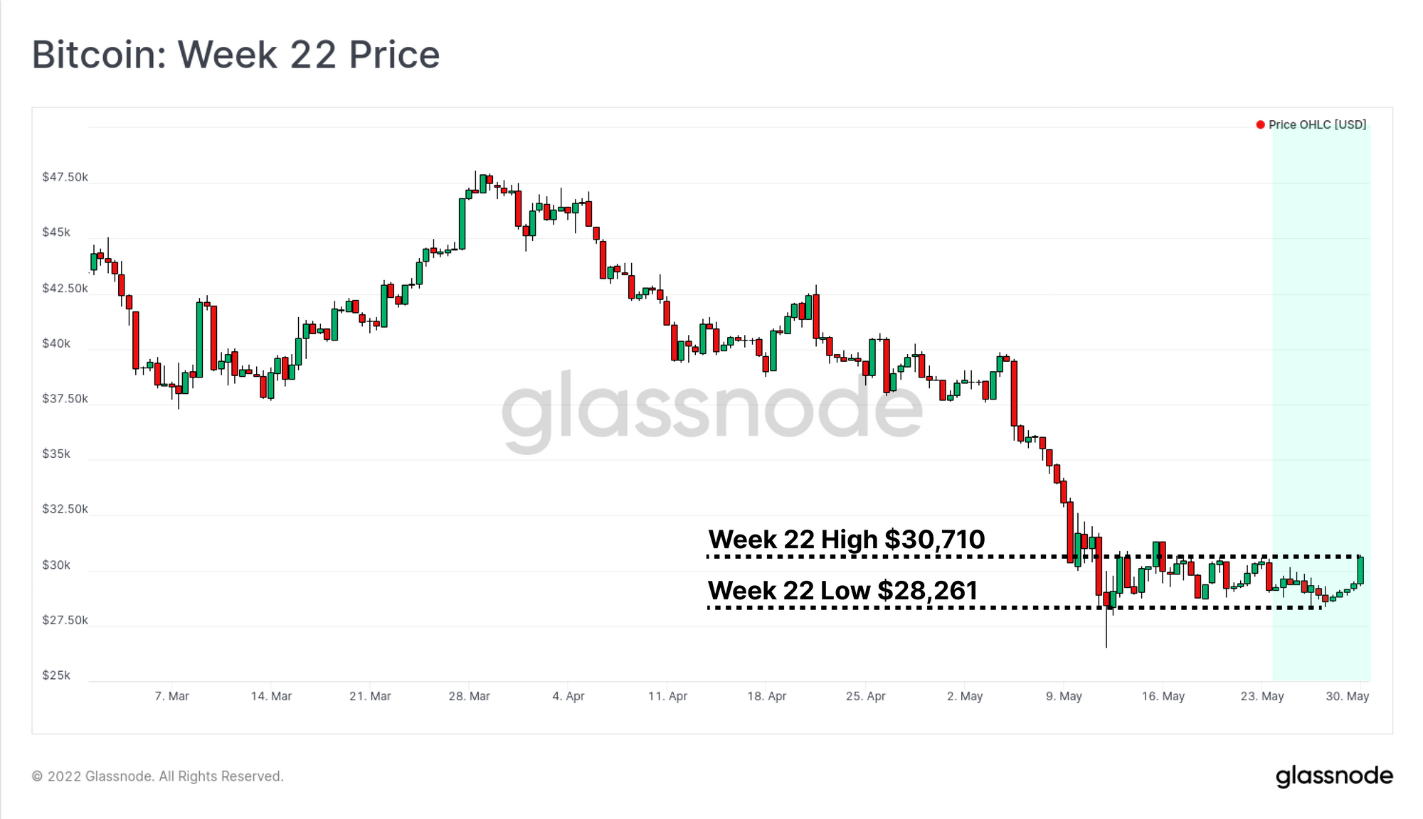 Bitcoin prices continued to consolidate this week, after initial signs of a potential decoupling between digital asset markets, and traditional equity markets, albeit in the wrong direction. The S&P500 index rallied 7.4% from the lows this week, and the NASDAQ was up 9.6%. Meanwhile, Bitcoin traded down to a low of $28,261, and only rallied early on Monday to recover the weekly high of $30,710. Ethereum also had a tough week, shedding 17.8% of its value to a low of $1,700, before rebounding to $1,900 on Monday morning.
