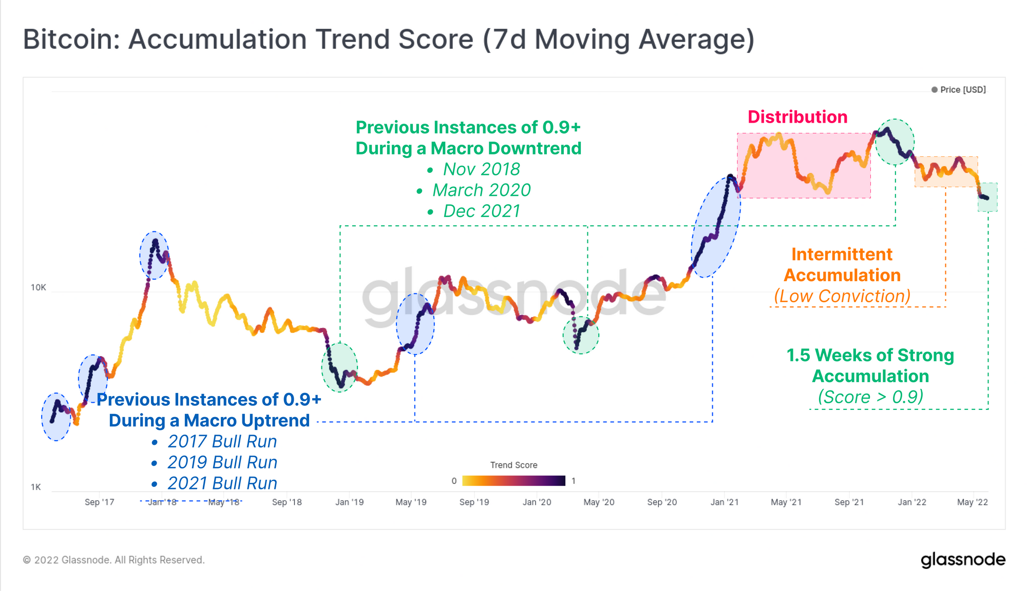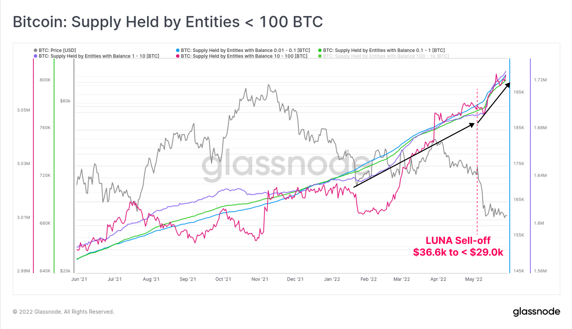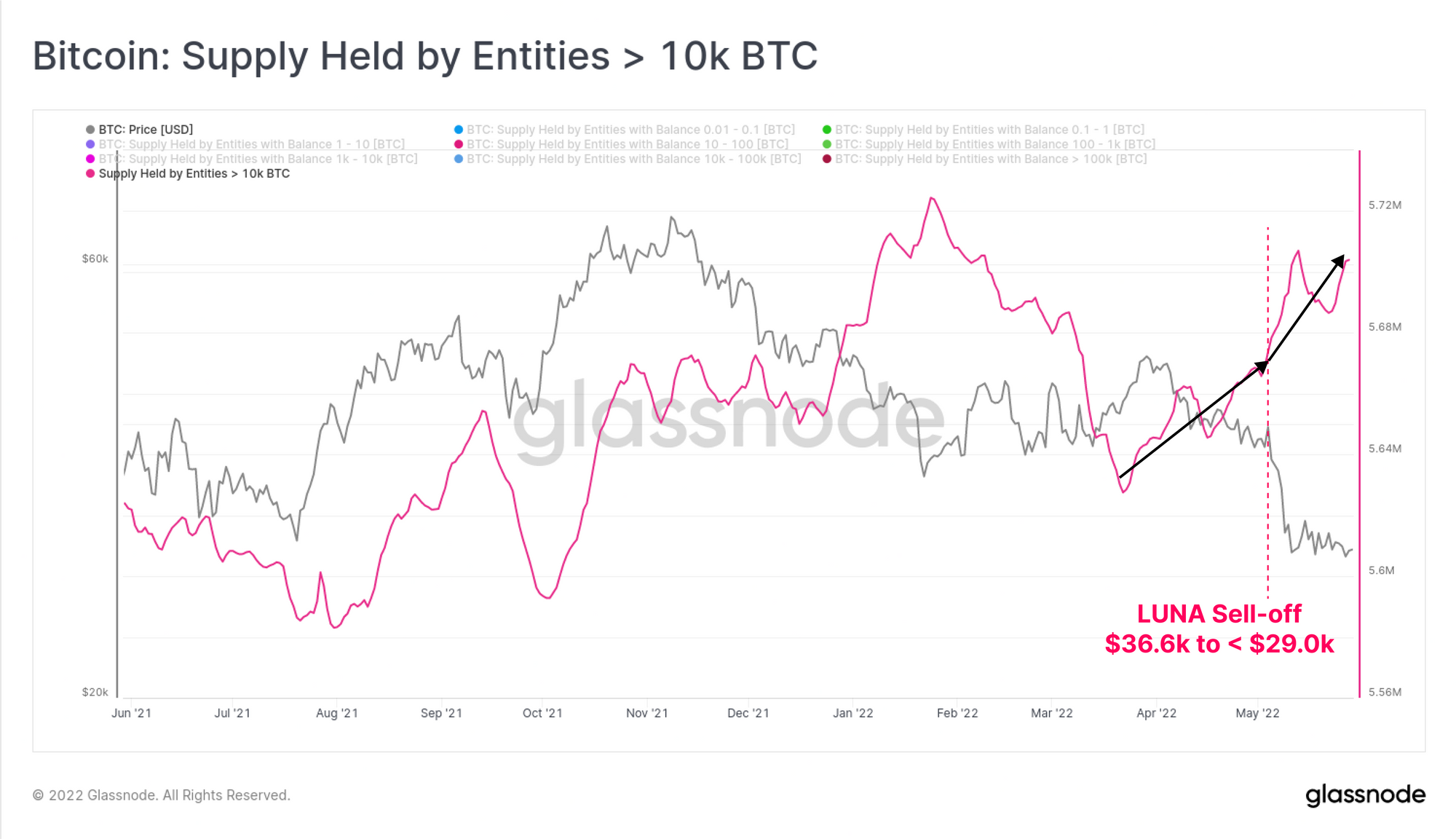 After the LUNA motivated sell-off event earlier in the month, there has been a distinct behavioural change in Bitcoin on-chain accumulation trends. In particular, entities with balances < 100 BTC, and those with >10k BTC have been significant accumulators. The remaining wallet cohorts have also transitioned from net distributors, to neutral. This reflects a notable shift in behaviour compared to the Feb-mid May period which was intermittent accumulation and distribution, reflecting uncertainty and a rotating capital.