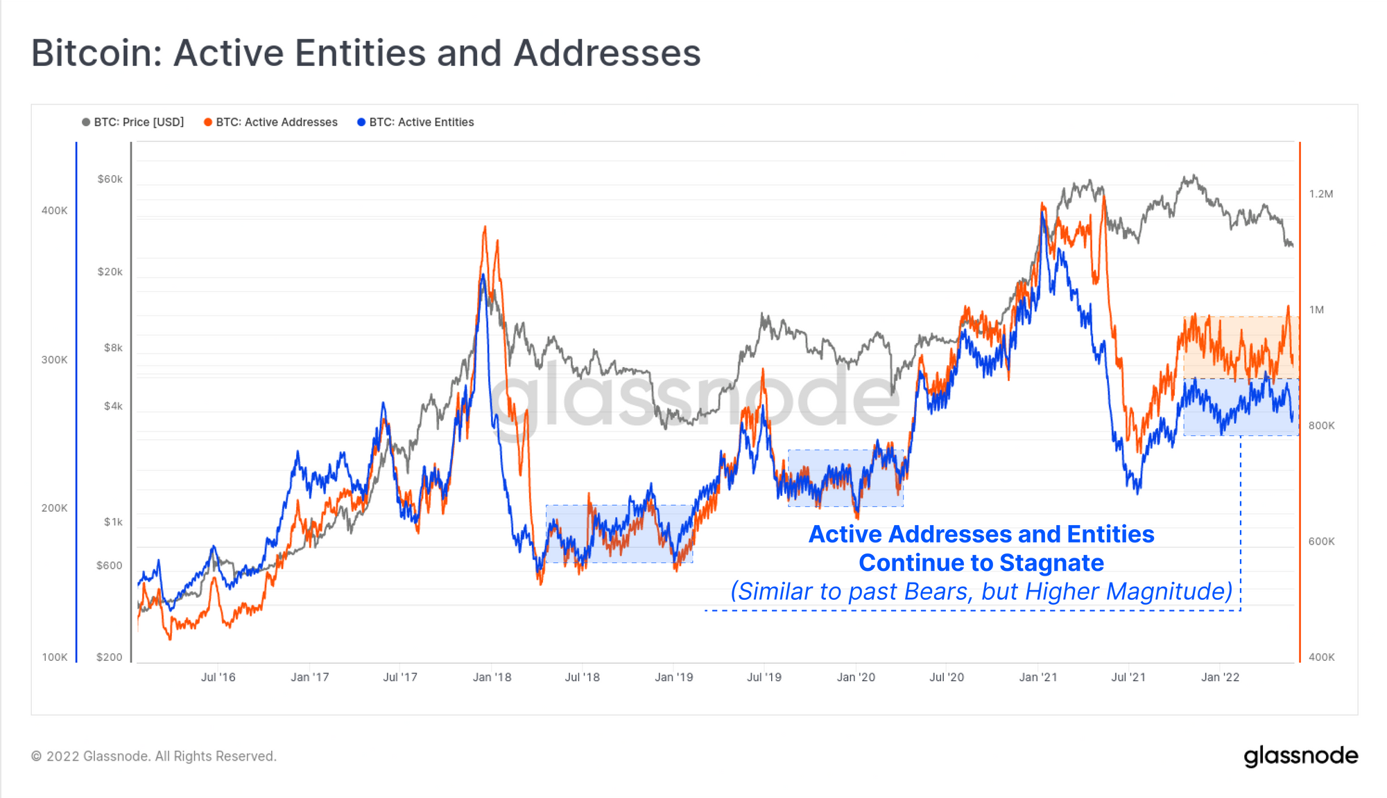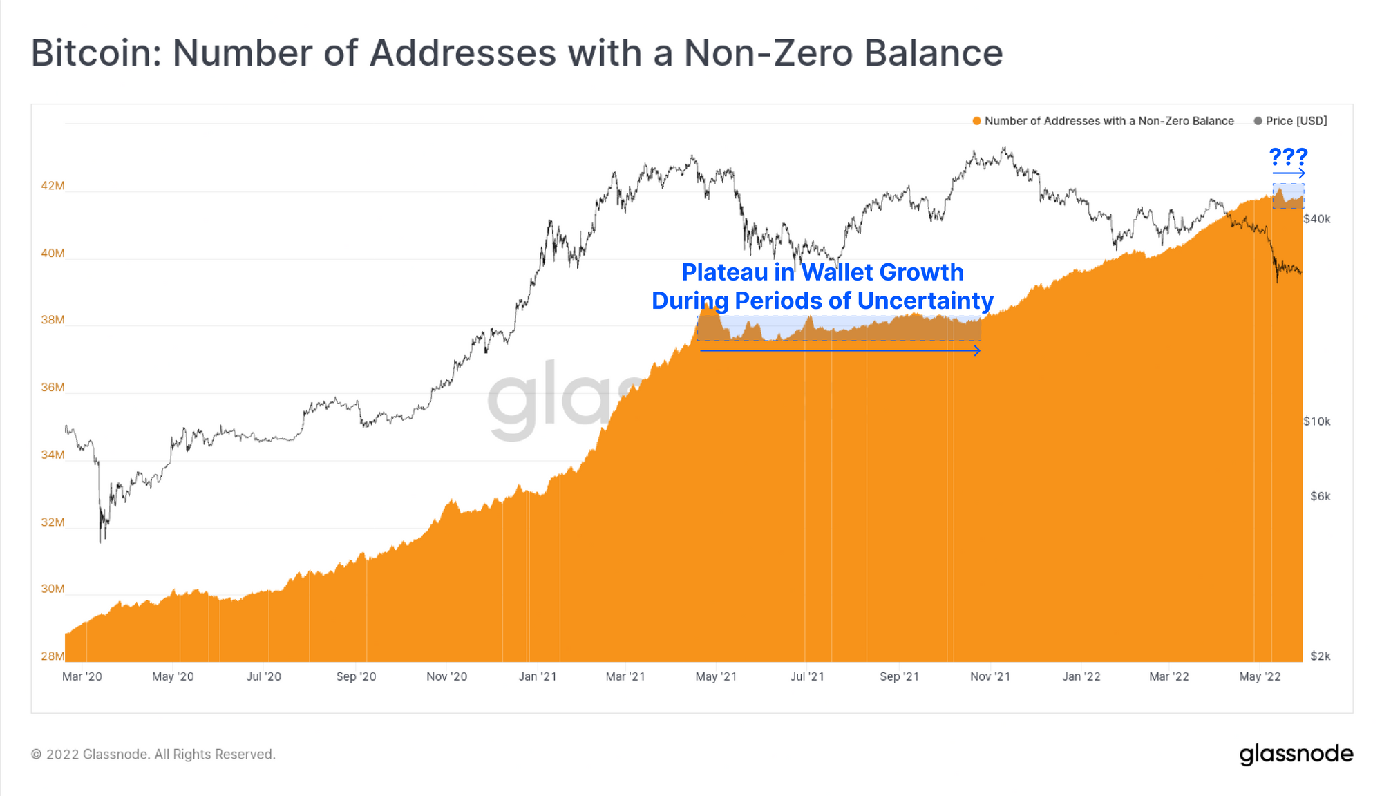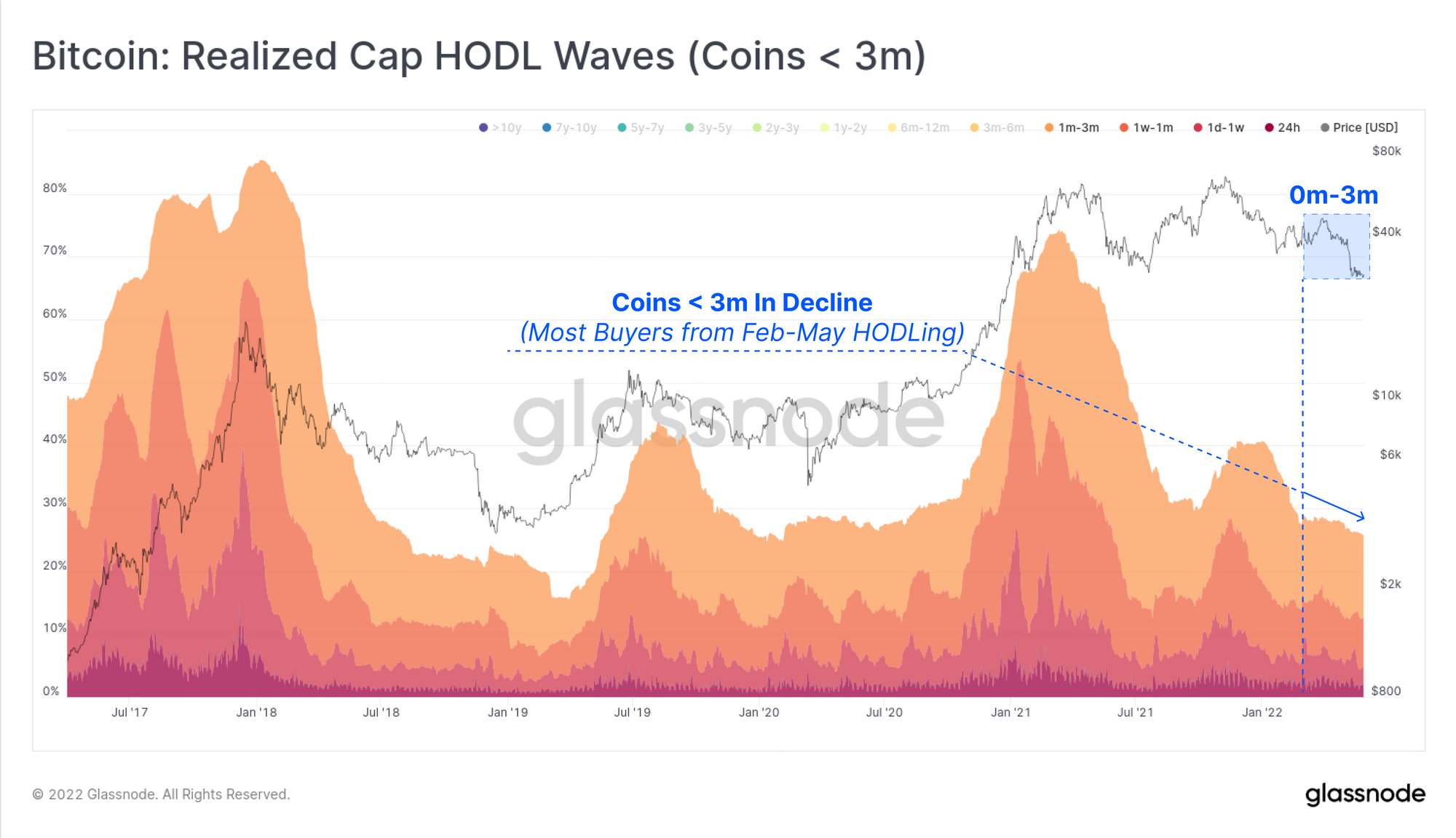 After the LUNA motivated sell-off event earlier in the month, there has been a distinct behavioural change in Bitcoin on-chain accumulation trends. In particular, entities with balances < 100 BTC, and those with >10k BTC have been significant accumulators. The remaining wallet cohorts have also transitioned from net distributors, to neutral. This reflects a notable shift in behaviour compared to the Feb-mid May period which was intermittent accumulation and distribution, reflecting uncertainty and a rotating capital.