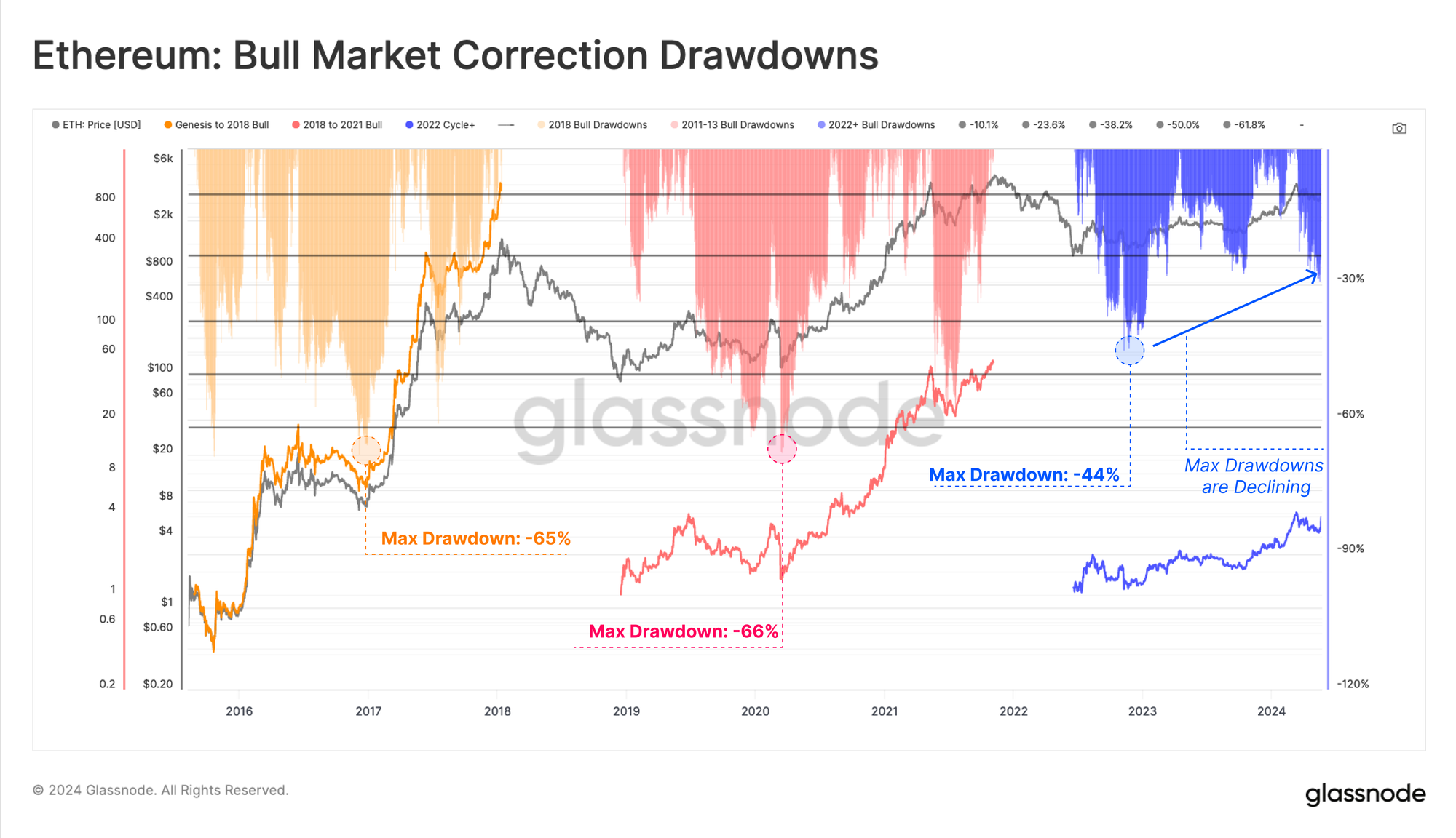Ethereum has also seen notably shallower corrections since the FTX lows compared to prior cycles. This structure infers a degree of increasing market resilience is developing between each successive pullback, alongside a reduction in downside volatility.