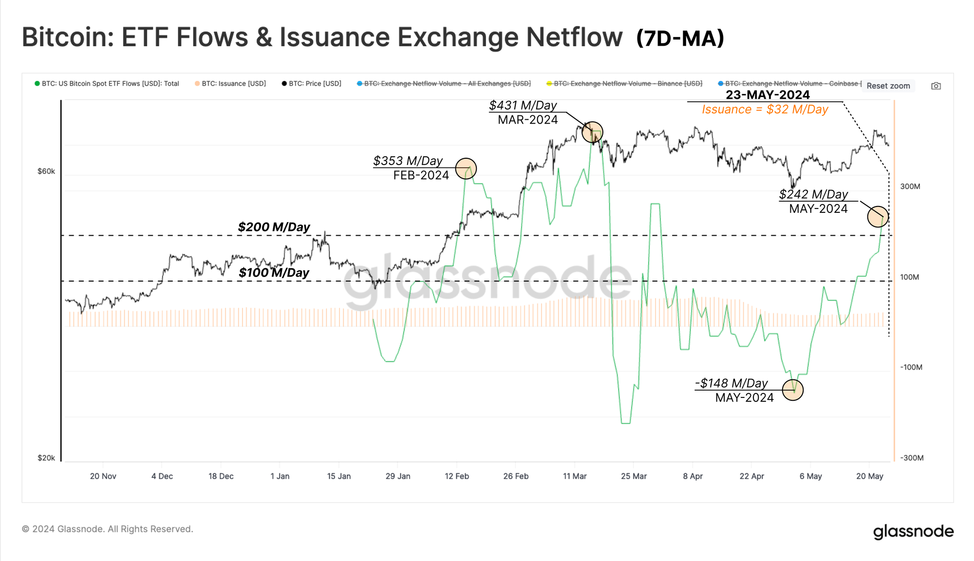 - Bitcoin US Spot ETFs netflows have once again turned positive after four weeks of net outflows, suggesting a return of TradFi demand.