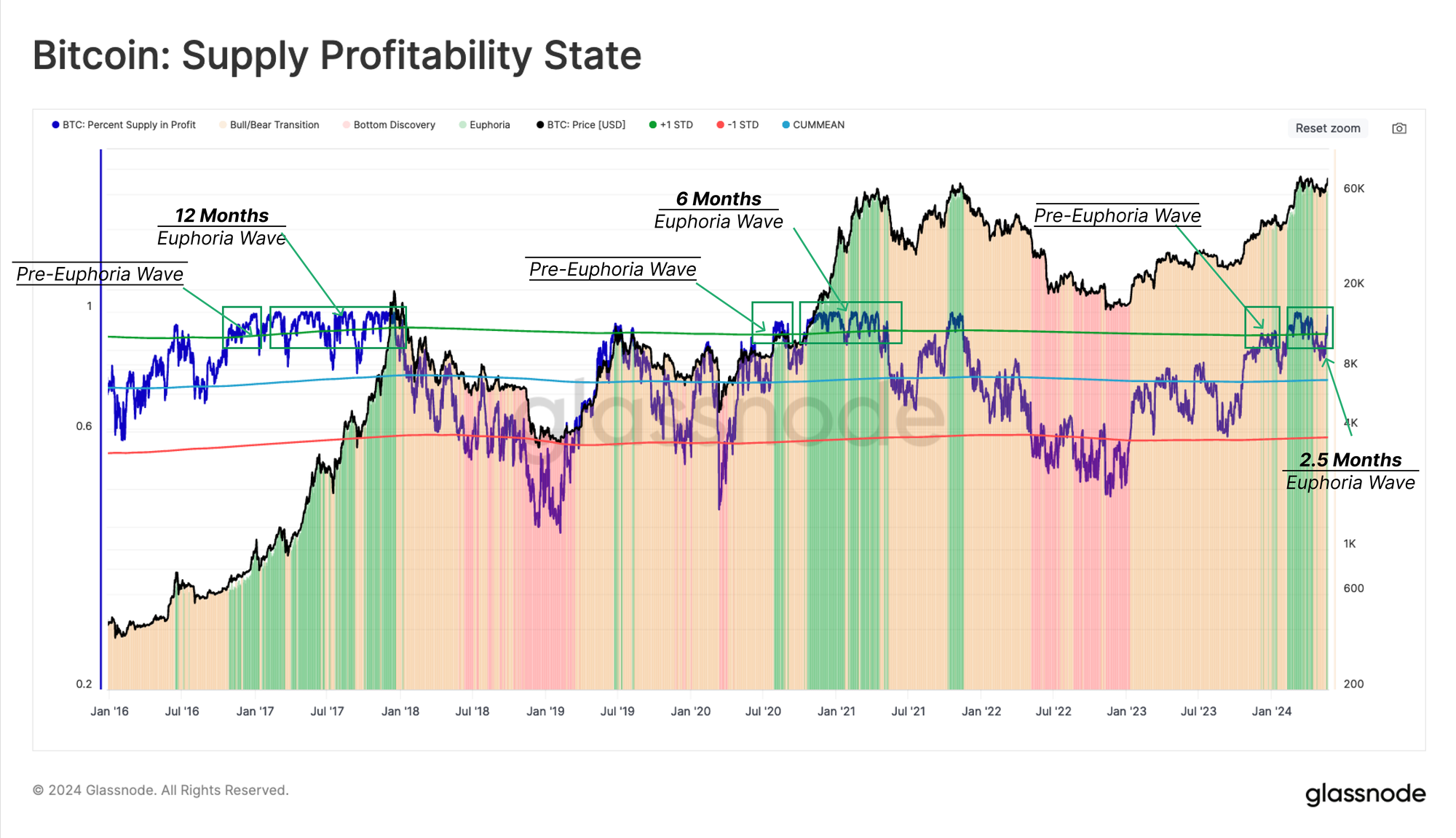 The percentage of the circulating supply in profit provides valuable information over each market cycle, and a set of repeating patterns has emerged. During the early stages of a bull market, as price attempts to reclaim the prior ATH, the percent of supply in profit breaks above its statistical threshold of ~90%. This signals the start of the Pre-Euphoria phase, and it historically entices investors to take profit from the table.