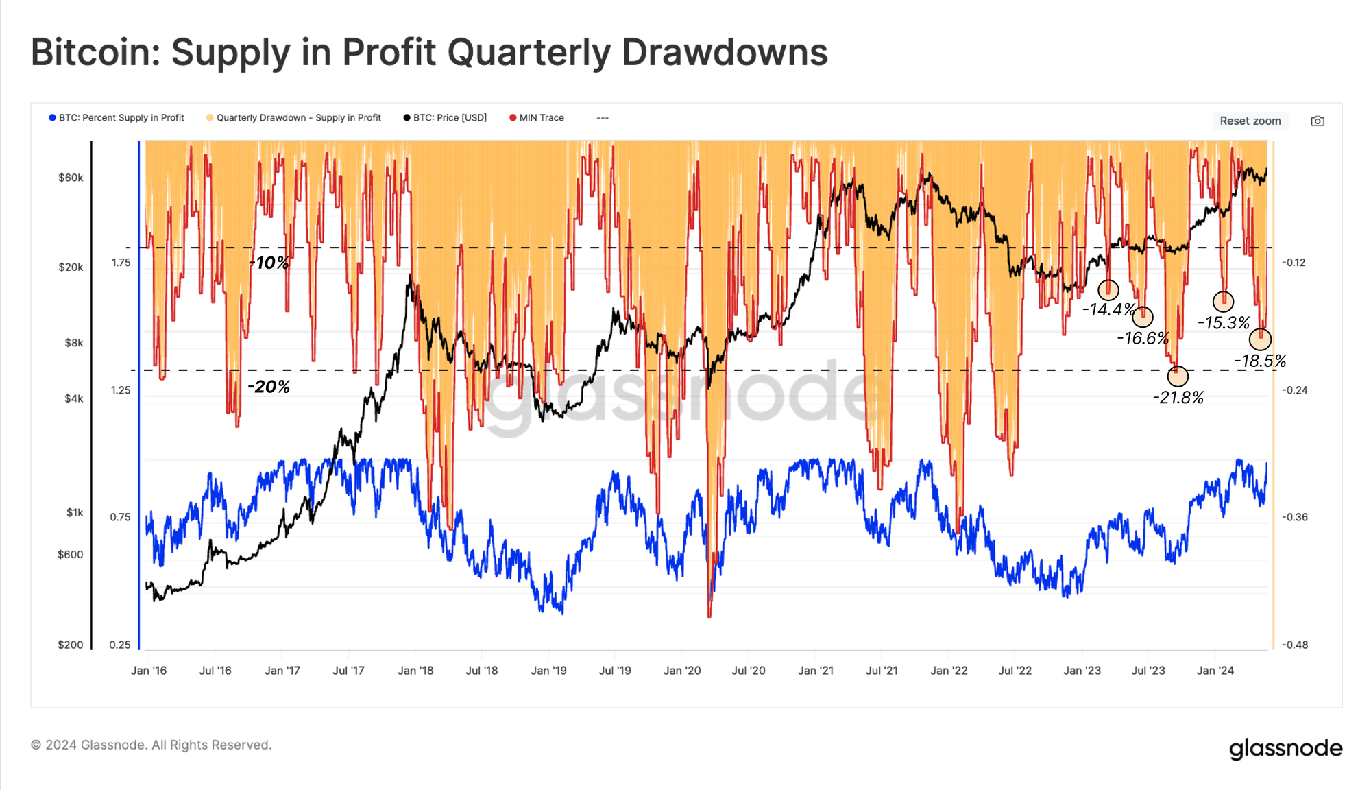 After recording the deepest correction on a closing basis since the FTX lows (-20.3%), Bitcoin has recovered back towards the ATH, reaching $71k on 20-May. From a comparative point of view, the drawdowns pattern across the 2023-24 uptrend appears to be remarkably similar to the 2015-17 bull market.