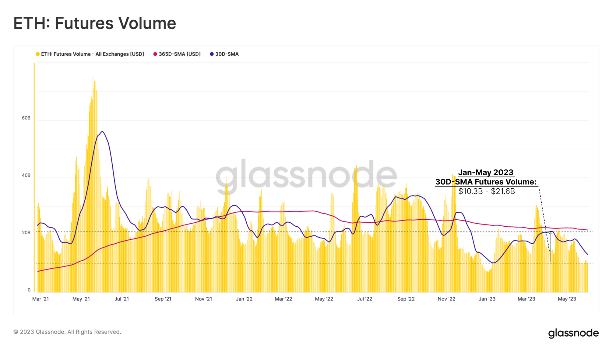 After the FTX collapse, futures trade volume collapsed to just ~$7.5B/day. Volumes have seen a comeback in 2023, however the 30-day average ($12.0B/day) remains well below the yearly average ($21.5B/day).