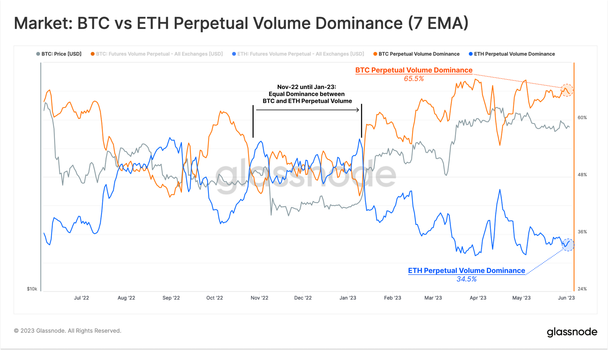 We can see a supporting trend in the relative volume dominance between BTC and ETH in perpetual swap markets. Whilst trade volume between both assets reached parity in late 2022, Ethereum's relative share of futures volume has decreased massively in 2023.
