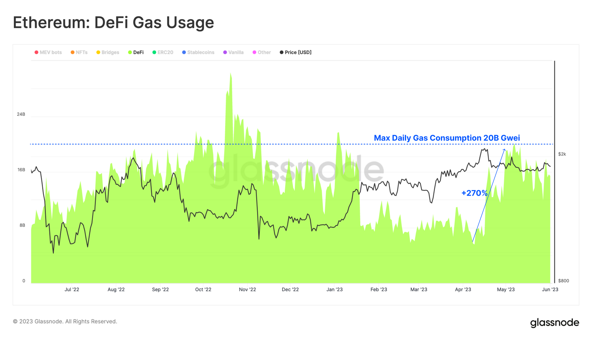 Smart contract interactions are more gas intensive and can cost multiples of a simple transfer. Gas usage associated with DeFi protocols rose 270% in late April, pushing daily gas consumption by the sector above 20B gas units.