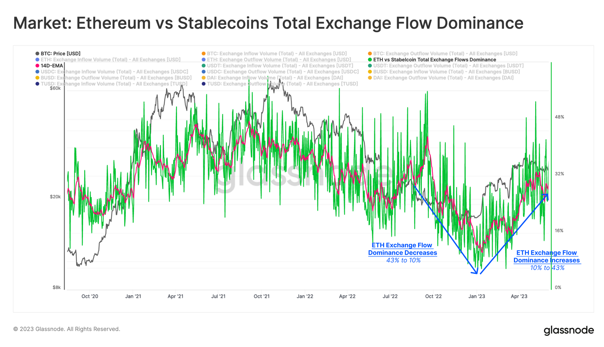 In 2023, we observed a strong reversal, with ETH's proportion of exchange flows rising back to 25%. However, this trend stalled in early May, suggesting a potential change in risk appetite. Investors who benefited from the strong first quarter returns, may be starting to transition capital back towards stablecoins.