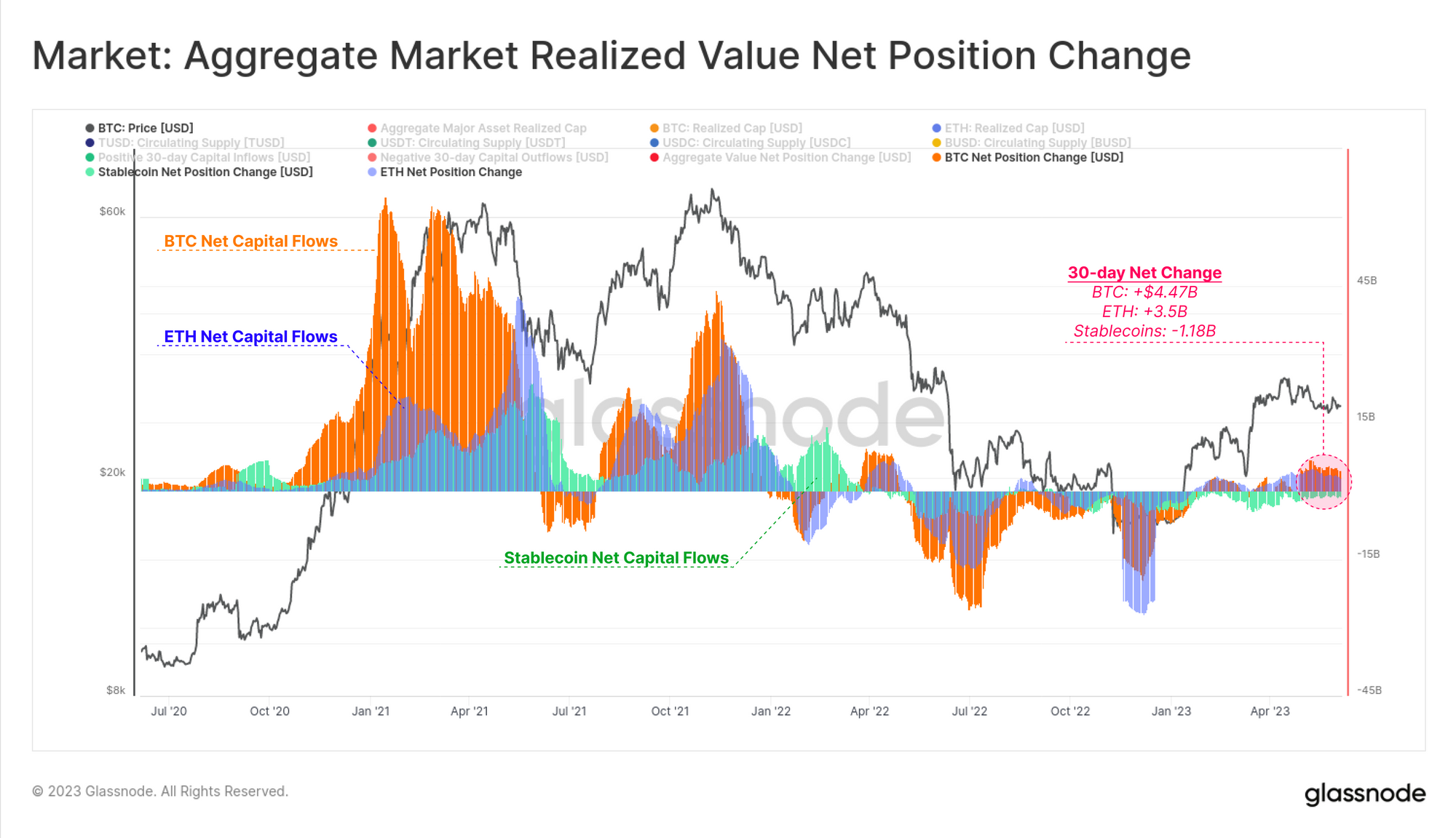 Negative values suggest that we have seen a net sell-side regime since the beginning of April 2023, where inflows of BTC+ETH started to exceed those of stablecoins. This is a distinct break from the significant buy-side pressure seen in Q1, with buy-side weakening in early April, which coincided with the start of the prevailing market correction.