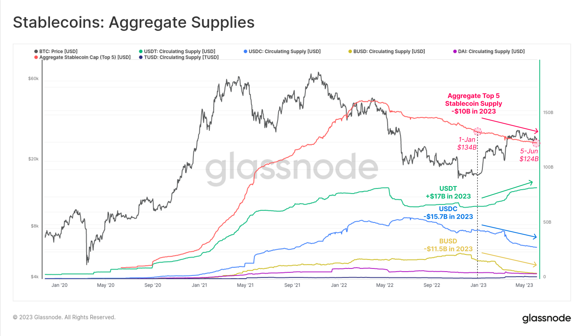 Recent stablecoins capital outflows are driven primarily by the second (USDC), and third (BUSD) largest assets, seeing supplies fall in 2023 by -$15.7B and $-11.5B, respectively. USDT has absorbed a significant proportion of these flows, pushing to a new ATH supply of $83.1B.
