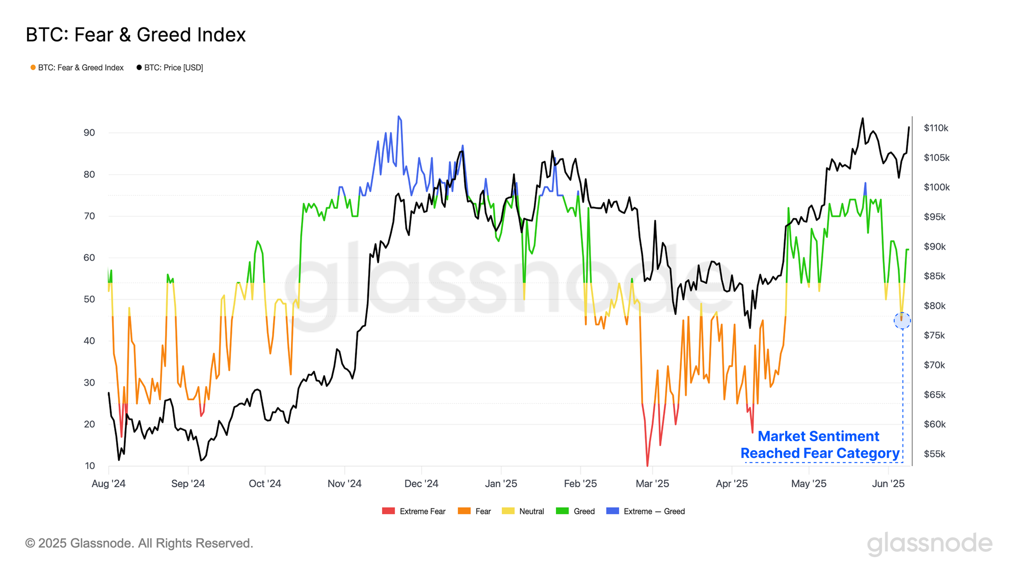 Despite the relatively shallow drawdown to $101k, sentiment across market investors took a notable hit, with the Fear and Greed Index briefly dipping into the 'Fear' category. One potential reason for this sharp shift in sentiment was investor concern over a possible double-top formation, reminiscent of the 2021 cycle.
