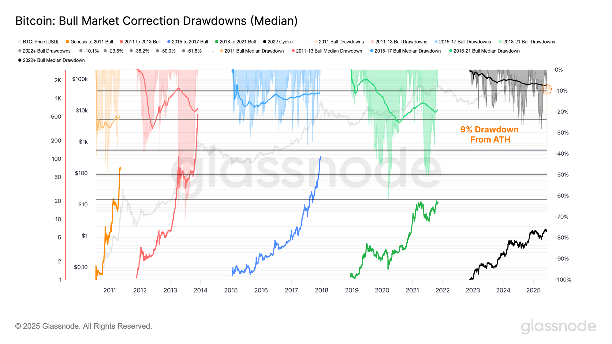 When measuring the market correction as a percentage drawdown from the ATH, the correction amounted to just -9%, with 384 out of 928 trading days (41.4%) this cycle experiencing a larger drawdown. This decline also closely aligns with the cycle’s median drawdown of 7%, indicating that, from a price perspective, the severity of the contraction was broadly consistent with typical market behavior this cycle.