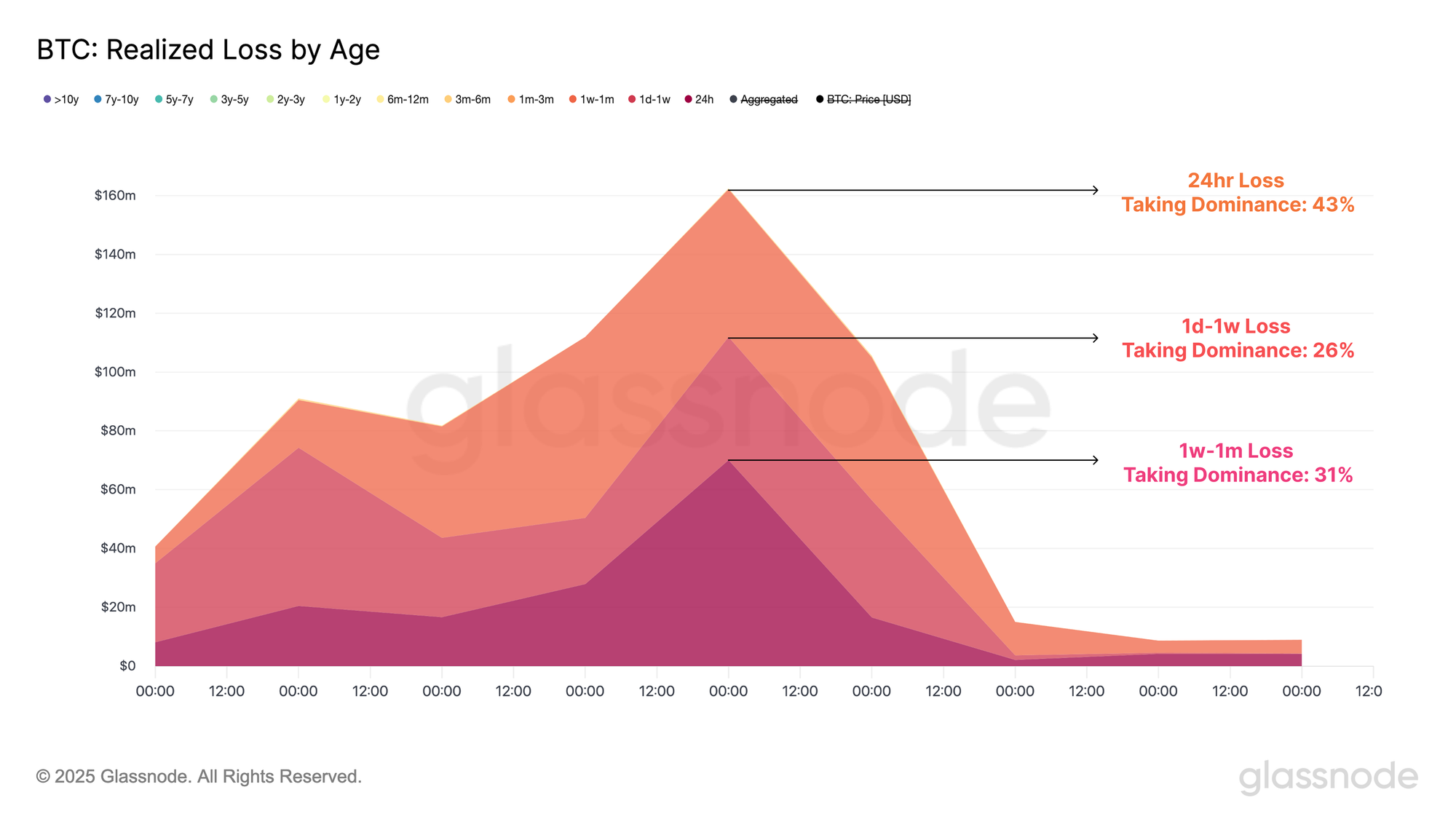 Increasing granularity, when inspecting the composition of the loss taking transactions, the majority of losses originate from the front end of the Short-Term Holder curve, with only the newest of investors capitulating across the market correction.