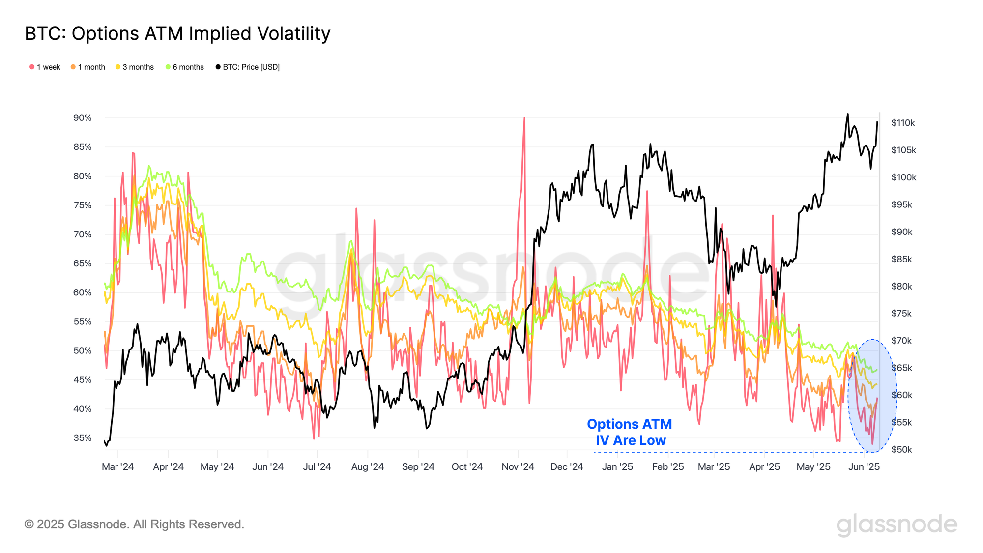 Concurrently, volatility expectations are beginning to rise, driven by the dense concentration of coin supply near the current spot price. This clustering increases market sensitivity to price fluctuations. However, Options At-the-Money Implied Volatility (ATM IVs) across all major tenors remain historically low, suggesting that options traders may be underpricing the likelihood of a volatility regime shift.