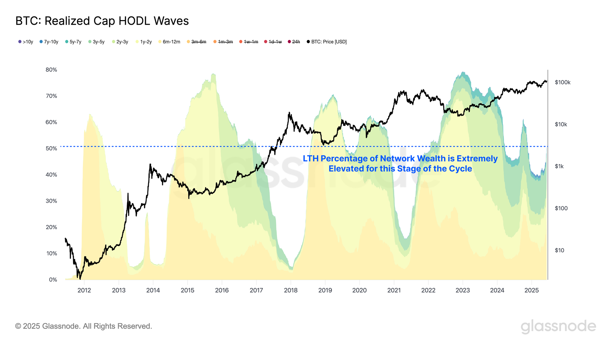 Despite the marked increase in Long-Term Holder profit-taking and spending activity, the proportion of network wealth held by the cohort continues to rise. This dynamic highlights that maturation and accumulation pressures are outweighing distribution behavior.