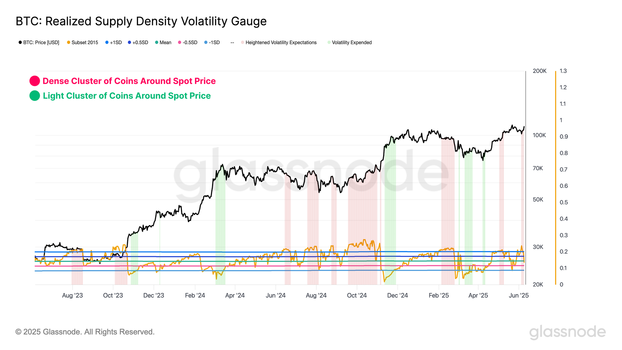 The Realized Supply Density metric offers a valuable lens through which to evaluate the concentration of coin supply with a cost basis near the current spot price. Elevated values indicate a dense cluster of coins acquired at or around current prices. In such environments, even modest price fluctuations can affect a broad swath of investors, often amplifying market sensitivity and, in turn, volatility potential.