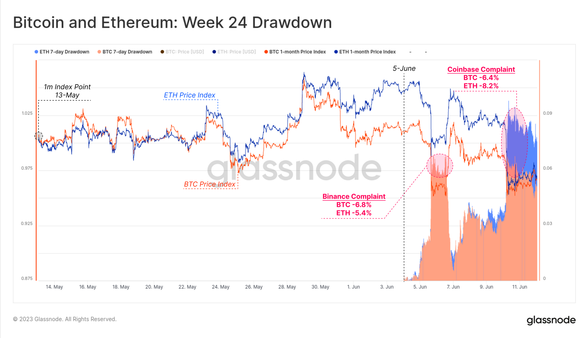 As news of the Binance charges broke on 5-June, digital asset markets traded lower, with ETH down -5.4%, and BTC down -6.8%. Both assets recovered these losses as news of the Coinbase charges landed on 6-June. However, by the end of the week ETH had sold off further, down -8.2%, whilst BTC held up slightly better at -6.4%.
