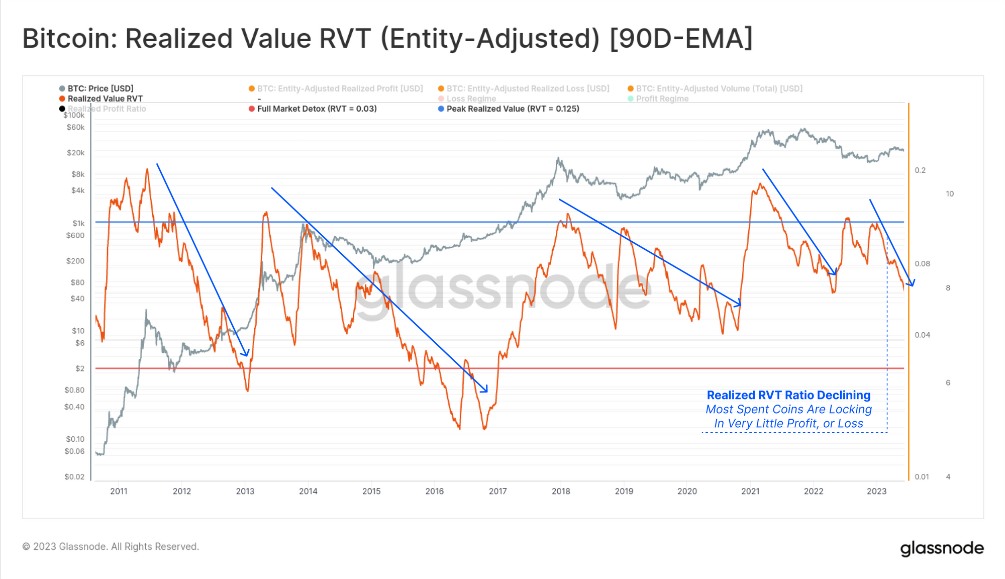 Similar to the Sell-side Risk Ratio, we can also compare the amount of realized profit and loss to this transfer volume via the Realized RVT Ratio. This metric is also in a strong downtrend, which is typical of bearish trends, as apathy, and boredom take hold.