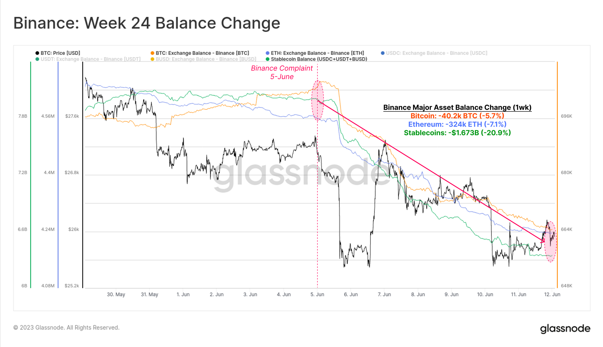 The regulatory environment in the US remains hostile, with the SEC filing very significant charges against the two largest exchanges, Binance and Coinbase. The balances of major assets on these two exchanges have declined this week, as a portion of customers withdraw out of concern. With the exception of stablecoins at Binance, the declines are well within typical patterns, and it remains to be seen how investors react as both lawsuits play out.