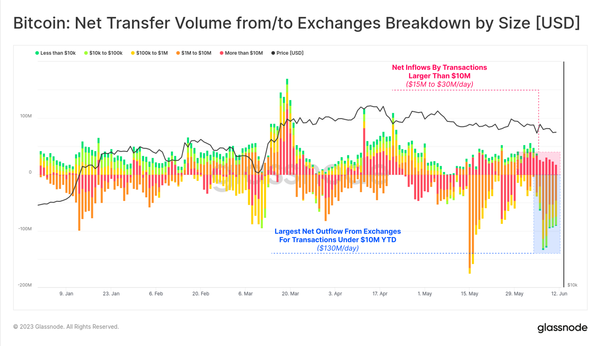 - Transactions below $10M in size have seen consistent withdrawals, with a net outflow of over $130M/day maintained all week.